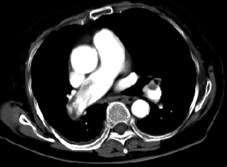 Three days after surgery, the patient demonstrated a distinctly improved mental condition with no further syncopal attacks. An enhanced chest CT scan 10 days after surgery revealed evident improvement of the thrombosis in the right main pulmonary artery and left inferior pulmonary artery branch, as well as disappearance of the pleural effusion, compared with the previous chest CT scan (Fig. 5). Color ultrasonography revealed a significant decrease of pulmonary artery pressure and right heart load; the systolic pulmonary arterial pressure was 71 mmHg. The patient was discharged from hospital 26 days after admission, with continued daily administration of 2.5 mg warfarin. Based on the monitoring of PT and INR, the doctor suggested discontinuation of warfarin 3 months after hospital discharge. The study was approved by the Ethics Committee of Taizhou People’s Hospital, Jiangsu, China and according to the Declaration of Helsinki. Written informed consent was obtained from the patient.