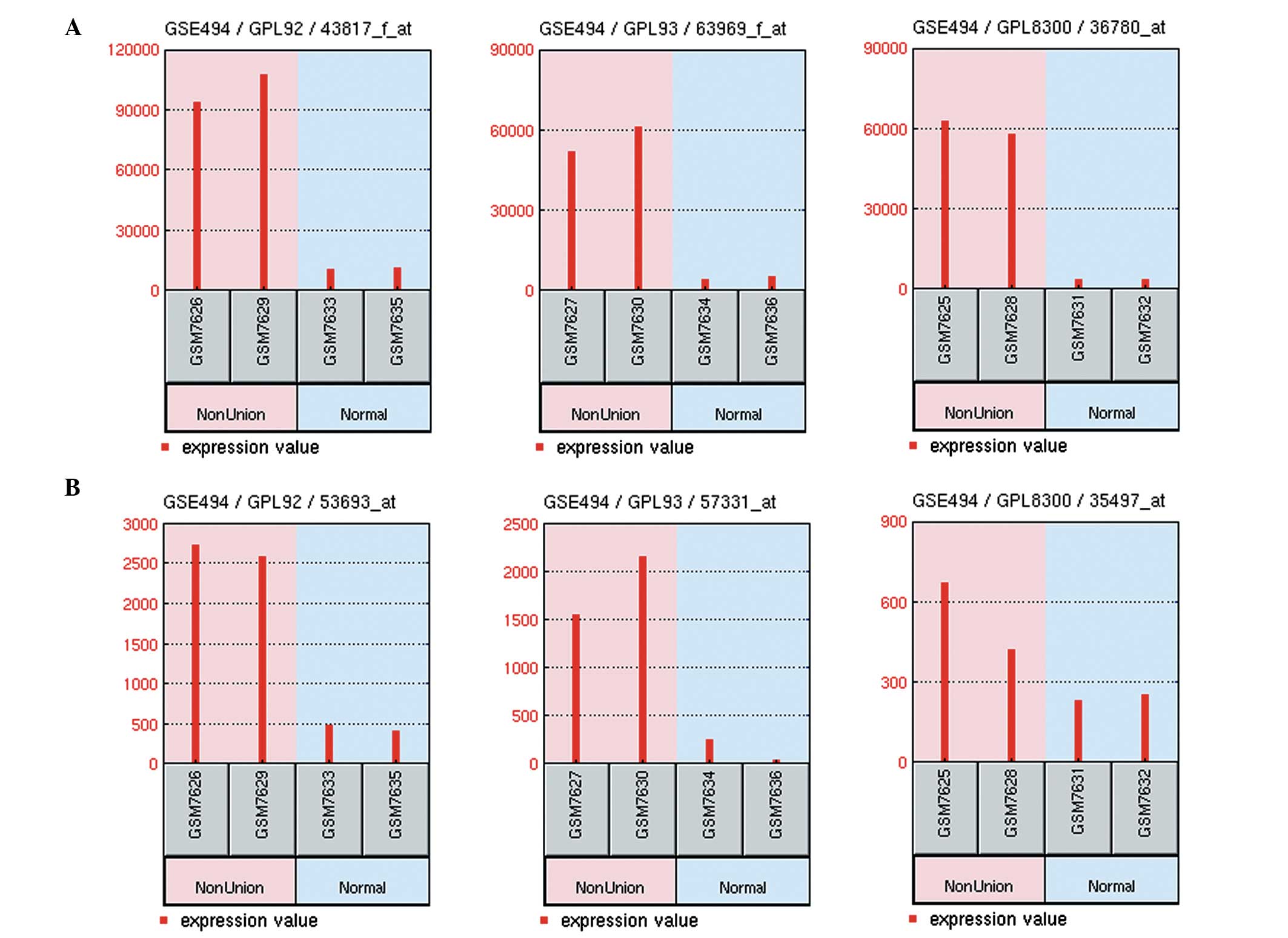 Xu J, Zhang C and Song W: Screening of differentially expressed genes associated with non‑union skeletal fractures and analysis with a DNA microarray. Exp Ther Med 7: 609-614, 2014.
