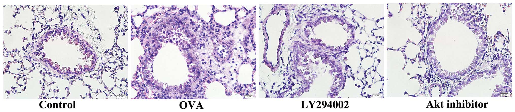 To determine the role of the PI3K/Akt signaling pathway in inflammatory cell infiltration, LY294002 and Akt inhibitor IV were administered intratracheally to the asthmatic mouse model. Histological analysis, as presented in Fig. 4, demonstrated that LY294002 and Akt inhibitor IV may attenuate inflammatory cell infiltration as compared with the OVA-induced asthmatic group.