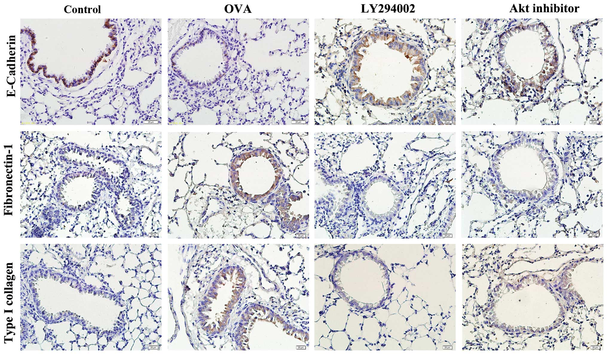 To verify the effects of the PI3K/Akt pathway on OVA-induced airway remodeling, the expression levels of E-cadherin, fibronectin-1 and type I collagen in the airway epithelium cells were detected by immunohistochemistry following LY294002 and Akt inhibitor IV intratracheal administration. High expression levels of fibronectin-1 and type I collagen were identified in the epithelial cells of the airway in the asthmatic mice; LY294002 and Akt inhibitor IV reduced this expression compared with the OVA group. By contrast, the expression level of E-cadherin decreased in the OVA-induced mice, and LY294002 and Akt inhibitor IV were shown to upregulate the expression (Fig. 5). In addition, higher expression levels of α-SMA and type I collagen were identified at the mRNA and protein levels in the OVA-induced mice. Therefore, blocking the PI3K/Akt pathway may inhibit the production of α-SMA and type I collagen (Fig. 6).