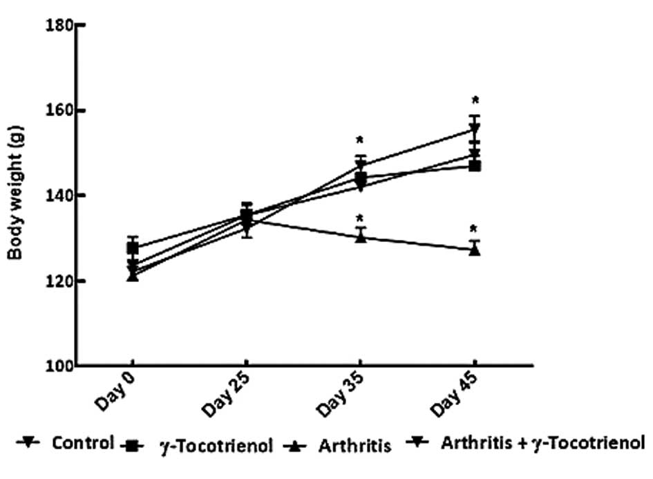 There was a significant increase in body weight in the normal control group and in the group with γ-tocotrienol alone (P<0.05). The arthritis alone group exhibited a significant decrease in body weight throughout the duration of the experiment (P<0.05). On day 35 and 45, the arthritis group exhibited a significant decrease in body weight compared with the other groups (P<0.05; Fig. 1).