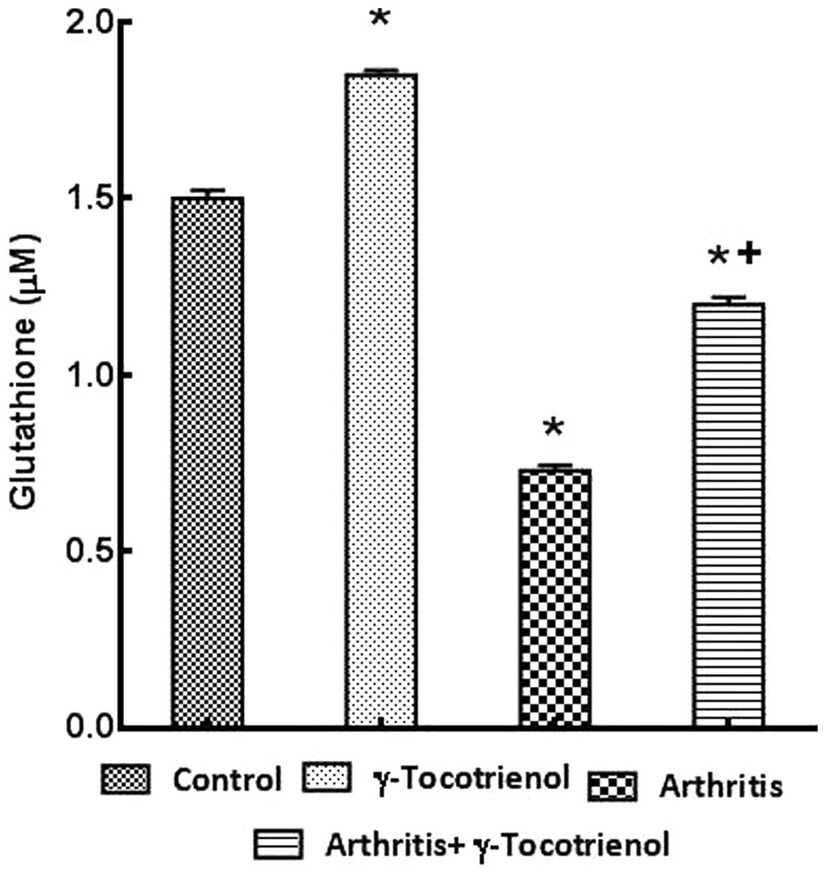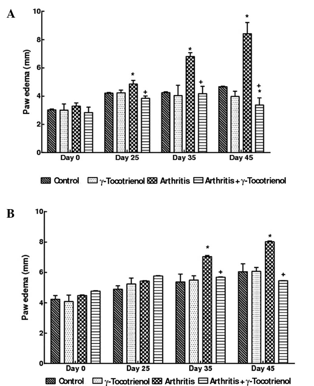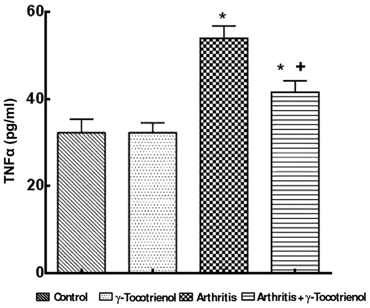 The animals were randomly assigned into the following groups: i) Control; ii) arthritis; iii) γ-tocotrienol alone; and iv) arthritis with γ-tocotrienol.