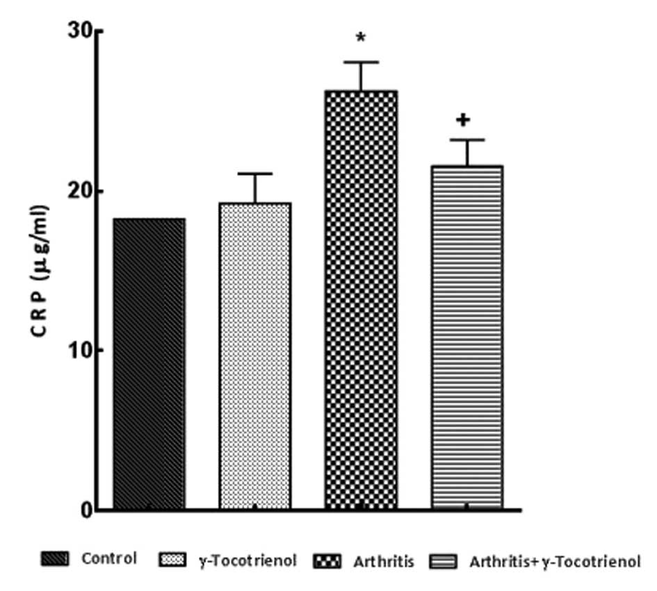 CRP is an inflammatory marker, which is a member of the group of acute phase proteins and the level of CRP increases in response to inflammation (26,27). The CRP assay is used as an optimal laboratory test for the observation of inflammation resulting from RA and other inflammatory diseases. It is an effective indicator of tissue damage and the concentration of CRP in serum is associated with disease activity (27,28). In the present study, an increased CRP level was observed in the circulation of rats with arthritis and treatment with γ-tocotrienol significantly inhibited the arthritis-induced CRP changes observed. The higher level of CRP observed in the arthritis group confirmed the pathology of the joint and the CRP production may have increased as a result of the activated macrophages and fibroblasts within the synovium of the inflamed joints. The production of CRP is also controlled by inflammatory mediators within the joints including IL (interleukin)-1 and IL-6, thus the reversal of CRP levels following supplementation indicates a significant decrease in the activation of synovial macrophages and fibroblasts (29).