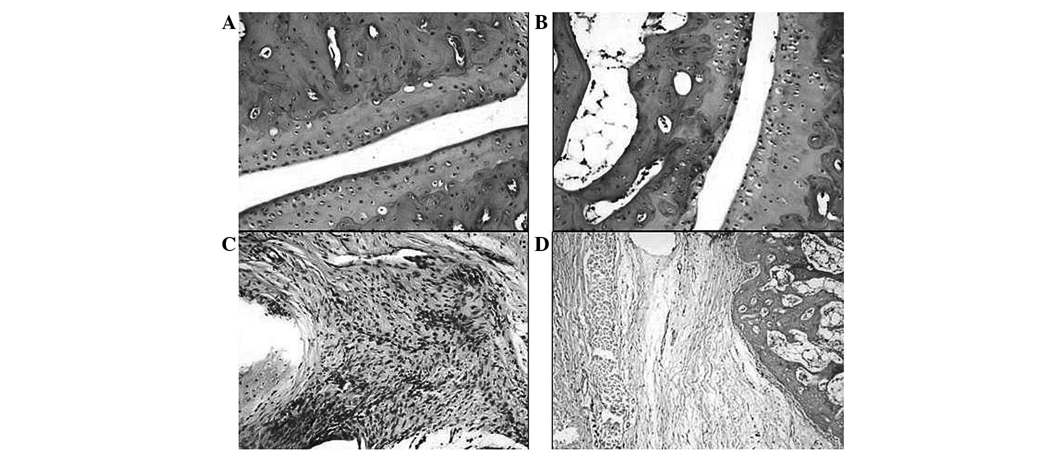 Following the sacrifice of the rats with overdose of anaesthesia (pentobarbital sodium), their joints were harvested, the flesh was removed from the bone and the joint samples were stored in 10% formalin solution for three weeks in specimen bottles. Blocks were prepared following the decalcification of the joints for 48 hours, the blocks were sectioned at 3–4 μm thickness and slides were prepared and stained with hematoxylin and eosin (H&E). The joints were evaluated and analyzed according to the grading system adopted in a previous study (19).