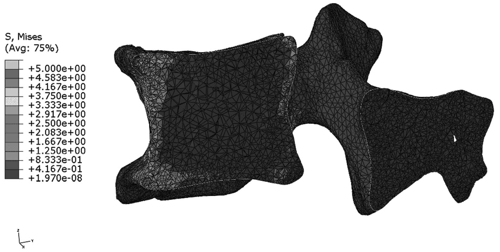 Figs. 9 and 10 indicate that stress is evenly distributed in the entire L1 of young individuals, without stress concentration under flexion. By contrast, the stress redistribution in the L1 of older patients indicates stress-concentration in the anterior cortex under flexion. Similarly, Figs. 11 and 12 show the stress redistribution in the L1 under extension in young and elderly patients, respectively. Stress redistribution in older patients resembles stress concentration in the anterior cortex, whereas that of young individuals resembles evenly distributed stress.