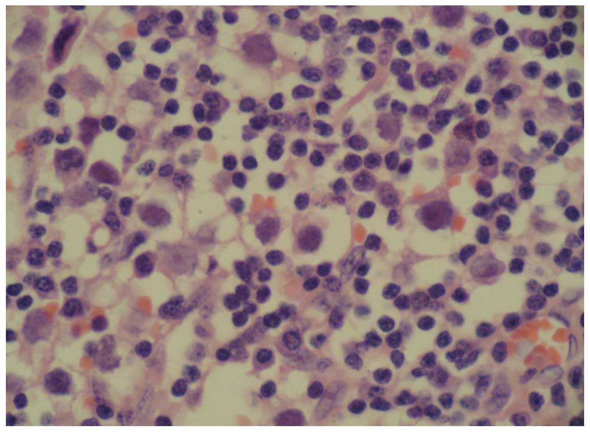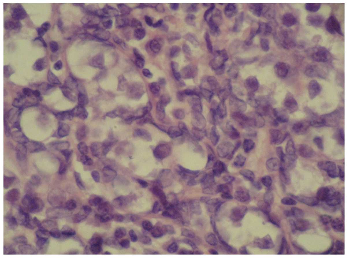 During the laparotomy, the small uterus was apparent with a size of 5.0×5.0 cm. The right gonad measured 4.0×3.0×3.0 cm, had an ovary-like appearance with a complete capsule, and was white, smooth and hard in texture; while the left gonad measured 3.0×3.0×3.0 cm and had a similar appearance to the right gonad. The uterine tubes were narrow. No testes or associated tissues were identified in the region between the superficial and deep inguinal rings and the urinary bladder, and the bifurcation of the common iliac artery. Bilateral gonadectomy was performed for simple gonadal dysgenesis. The patient was then pathologically diagnosed with bilateral ovarian gonadoblastoma and right dysgerminoma. The patient was genetically male due to her 46,XY karyotype, but socially and psychologically female in every respect; thus, an important aspect of postoperative treatment was to maintain the female characteristics. Estrogen (Premarin) and medroxyprogesterone acetate replacement therapy was administered. A four year follow-up showed that the patient treated with a sequential therapy of estrogen and progesterone had a regular menstrual cycle and no tumor recurrence.
