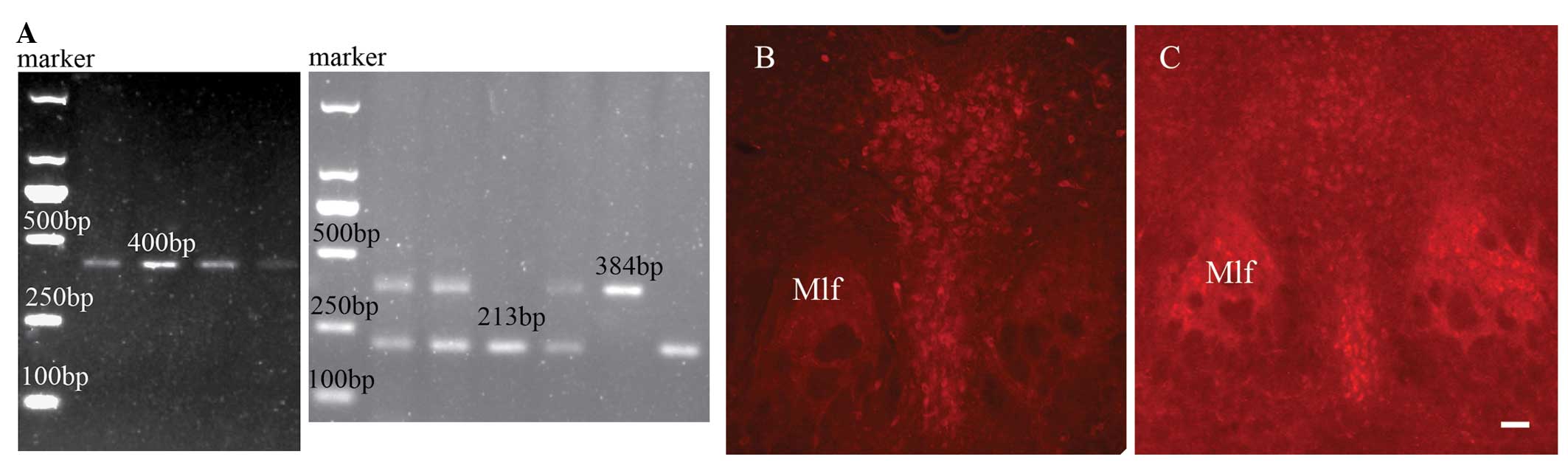 All animal protocols used in this study were approved by the Animal Committee of Tongji University School of Medicine (TJmed-010–10; Shanghai, China) (11). Adult (12 weeks old, weighing ~25 g) TPH2-knockout (n=6) and wild-type (n=6) mice were used for this study. For immunocytochemistry (n=3 from each group) (12), mice were anesthetized with pentobarbital [50 mg/kg, intraperitoneal (i.p.)] prior to undergoing transcardial perfusion with 4% paraformaldehyde. The brain was removed and placed in a 10% sucrose solution overnight. The following day, the brain was placed in a 20% sucrose solution for 2 h and then transferred into a 30% sucrose solution. The brain was subsequently sectioned on a microtome at a thickness of 40 μm. The sections through the brainstem were collected in a cell culture plate containing cryoprotectant [30% glycerol, 30% ethylene glycol and 40 μm phosphate-buffered saline (PBS)] (13). Serial sections were collected and placed individually into each of the six wells. This sectioning protocol resulted in six series of sections in total (~40 sections/series) through the brainstem that were 240 μm apart (40 μm × 6). Two wells from each animal were assayed for TPH2 expression.