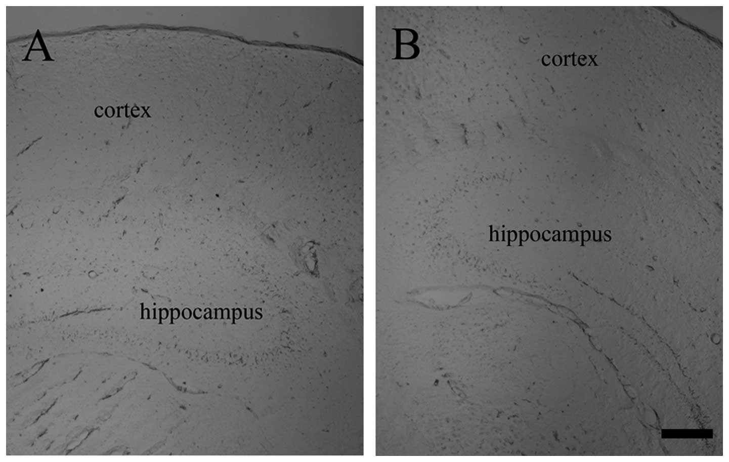 As shown in Fig. 2A and B, no EB stain could be observed in the whole brain in the TPH2-knockout or wild-type groups after 12 h EB i.p. injection. Similarly, no differences were observed in the tissue sections between the two groups (Fig. 3). Notably, when the mouse abdominal spaces were open, it was observed that the lung, heart, kidney and liver were all stained blue by EB. Furthermore, in order to verify the effect of the TPH2 gene on the BBB integrity, the permeability of the BBB was examined using the FITC-albumin leakage assay. FITC-labeled albumin was injected from the tail vein, and leakage of dye into the brain parenchyma was measured as an index of BBB permeability. FITC-albumin was restricted to the inside of the brain blood vessels and no significant signals were detected in the brain parenchyma in the two genotypes following PBS injection (data not shown). Quantification of the FITC-albumin leakage revealed that the severity of the BBB breakdown was not significantly different in the TPH2-knockout and wild-type mice. Therefore, it was speculated that the knockout of the TPH2 gene had no effect on the BBB. By contrast, BBB permeability has been shown to be influenced by the elevation of circulating 5-HT levels (16), neutralization of endogenous 5-HT activity and/or the blocking of its receptors (6,17). Therefore, the data on the effect of serotonin on BBB permeability are contradictory. This may be due to differences in the species used, the dose regimen applied or the animal model.
