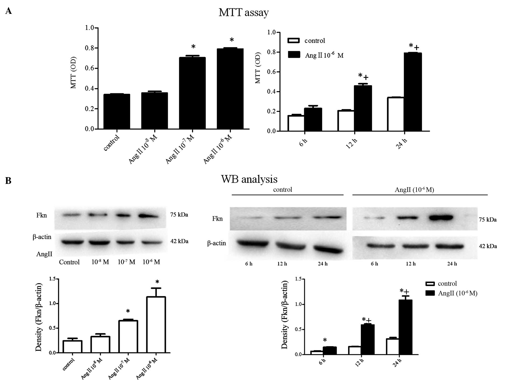 MTT assay showed that AngII could promote RASMC proliferation in a time- and concentration-dependent manner (P<0.05; Fig. 1A). Accompanied by the enhanced proliferation of RASMCs, Fkn protein expression, as shown by western blot analysis, was significantly upregulated following the use of AngII, and the overexpression was also in a concentration- and time-dependent manner (P<0.05; Fig. 1B). By contrast, control cells only showed a baseline Fkn expression.