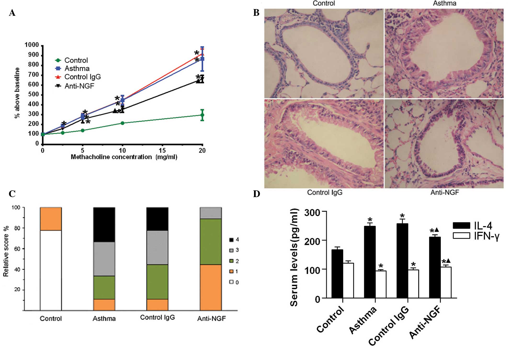 In addition, the serum expression levels of IL-4, as detected by ELISA, in the asthma and control-IgG groups were significantly higher when compared with the control group. However, the levels of IFN-γ were lower compared with those in the control group. By contrast, levels of IL-4 were reduced significantly, but levels of IFN-γ increased markedly, in the mice of the anti-NGF group when compared with those in the asthma and control-IgG groups (Fig. 2D). Therefore, these results indicated that NGF neutralization attenuates the Th2 response and strengthens the Th1 response in asthmatic mice.