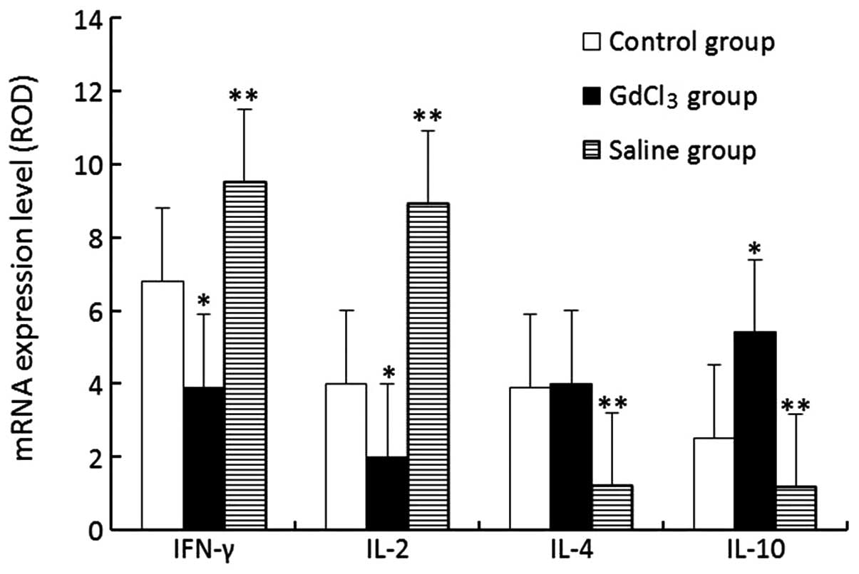 The expression levels of IFN-γ and IL-2 mRNA in the GdCl3 group were evidently lower compared with those in the control group (P<0.05); however, the IL-10 level in the GdCl3 group was higher than that in the control group (P<0.05) and the IL-4 levels showed no differences between the GdCl3 and control groups. The results for the saline group displayed an opposite trend to those in the GdCl3 group (Fig. 2).
