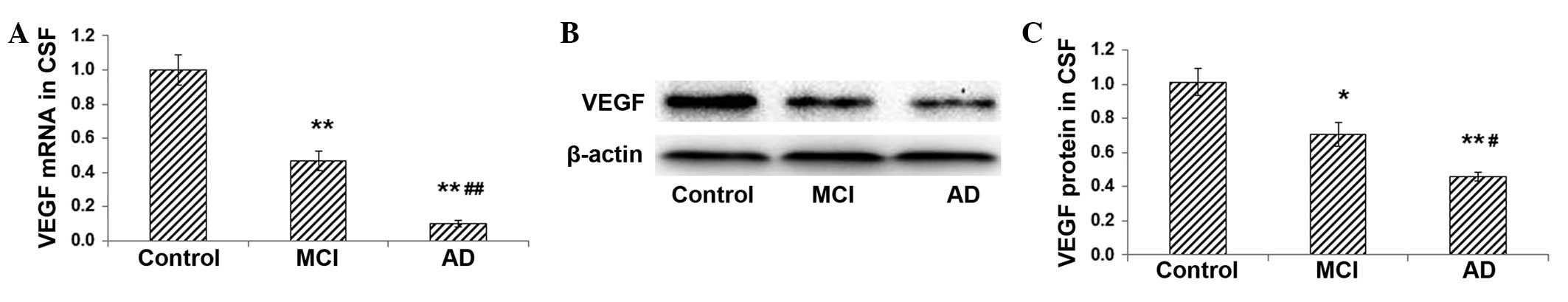 In conclusion, the present results showed that the expression levels of VEGF mRNA and protein were significantly decreased in the CSF and serum of patients with MCI and AD, with an evident decreasing trend with increased disease severity. Notably, as a modulator of VEGF expression, the level of miRNA-210 also declined in the CSF and serum in patients with MCI and AD. These results demonstrate that miRNA-210 is not only indicative of AD pathogenesis, but may also provide novel insights into the prevention and treatment of the disease.