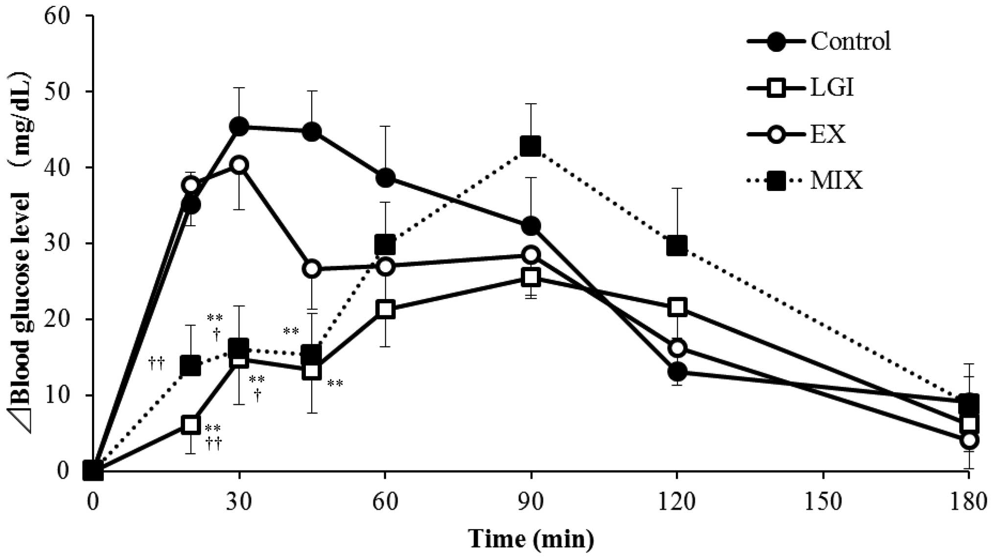 In the present study, the EX group exhibited an inhibited postprandial blood glucose increase at 45 and 60 min following the meal compared with the glucose level in the control group. The MIX group exhibited a greater increase in postprandial blood glucose level compared with that of the LGI group. In light of the aforementioned mechanism, the reason why the MIX group showed a greater increase in postprandial blood sugar level than the LGI group may be that the exercise was performed when the blood sugar level was not sufficiently high; thus, glucose was supplied from the liver.