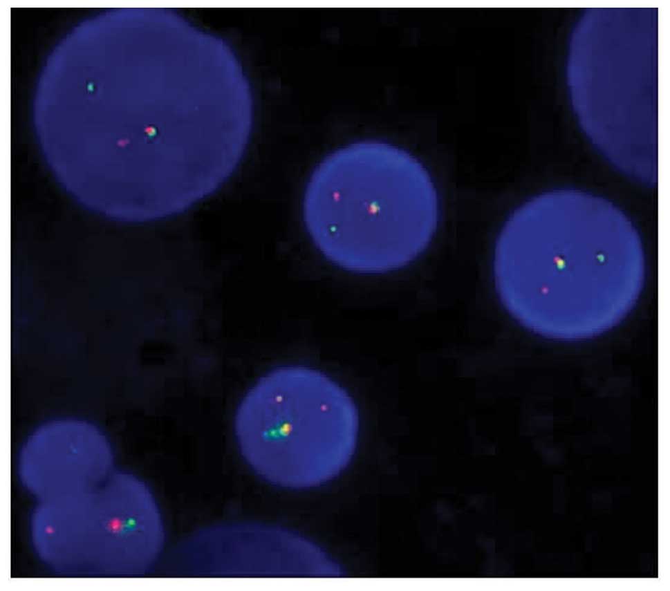 Lymph node biopsy revealed that the normal lymph node structure was destroyed and replaced by an abnormal diffuse infiltration of lymphocytes. Immunohistochemical staining revealed that the infiltrated lymphocytes were CD43, CD123 and CD68-positive (Fig. 2), a small scattering of cells were positive for CD20 and 40% of cells were Ki-67-positive. However, the cells were found to be CD10 and terminal deoxynucleotidyl transferase (TdT)-negative. Bone marrow aspiration analysis demonstrated that the blast cells consisted of 52% mononuclear cells and had variable sizes, agranular cytoplasm and irregular nuclei (Fig. 3). Bone marrow biopsy revealed hypercellularity with diffuse infiltration of tumor cells, accompanied by evident hyperplasia of fibrous tissue. Flow cytometric analysis of the bone marrow revealed the following cellular characteristics: CD4+, CD56+, CD117+, CD33+, HLA-DR+, CD43+, CD123+ (Fig. 4), CD34−, MPO−, CD36−, CD64−, CD303−, CD304−, CD19−, CD10−, CD20−, CD38−, CD138−, CD13− and TdT−. Traditional R-banding cytogenetic analysis did not detect any further chromosome abnormalities. The marrow sample was further probed using split-signal fluorescence in situ hybridization (FISH), which identified the rearrangement of ETV6 (Fig. 5). T-cell receptor gene rearrangement was not detected. Diagnosis of BPDCN was conclusive, based on the aforementioned findings. Notably, the blast cells were found to be positive for CD33 and CD117, which are myeloid leukemia-associated antigens.
