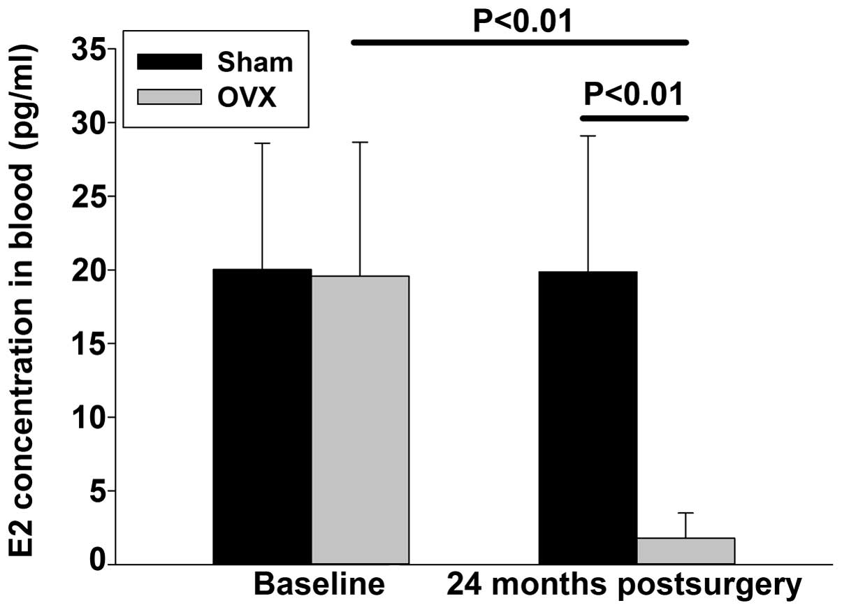 At 24 months after the ovariectomy, the serum estrogen levels in the OVX group (1.78±1.71 pg/ml) were significantly lower compared with those in the SHAM group (19.86±9.24 pg/ml). When compared with the baseline levels, the 24-month estrogen level of the SHAM group did not change significantly, whereas a statistically significant decrease in the estrogen levels of the OVX group was observed (Fig. 1).