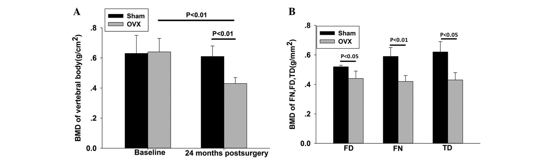 All data are expressed as the mean ± standard deviation. The Student's t-test was used to compare the mean values between the OVX and SHAM groups, while a paired t-test was used to compare the baseline data and the data collected at 24 months after surgery. All statistical analyses were performed using a commercial software package (SPSS 16.0; SPSS, Inc., Chicago, IL, USA). P<0.05 was considered to indicate a statistically significant difference.