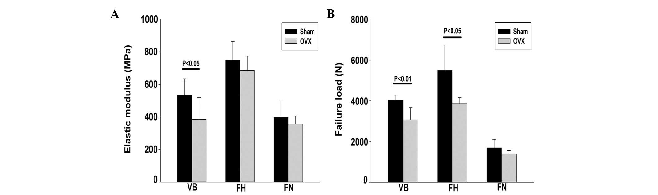 At 24 months after the surgery, the failure load and elastic modulus of the vertebral body were significantly lower in the OVX group compared with the SHAM group (P<0.05), with an overall decrease of ~24%. The failure load of the femoral head and femoral neck were also significantly lower in the OVX group when compared with the SHAM group, decreasing by ~30% (P<0.05) and 17% (P>0.05), respectively (Fig. 4).