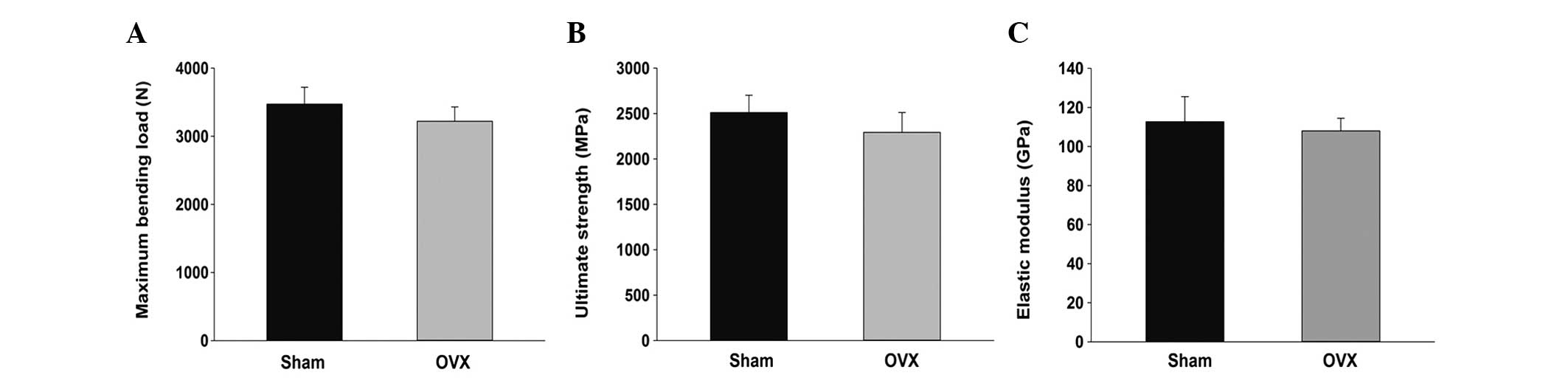 Results of the three-point bending test revealed that the maximum bending load of the tibia in the OVX group was less than that in the SHAM group, with a decrease of ~7%; however, this difference was not statistically significant (P>0.05). The ultimate strength and elastic modulus in the OVX group decreased by 4 and 7%; however, the differences were not statistically significant (P>0.05; Fig. 5).