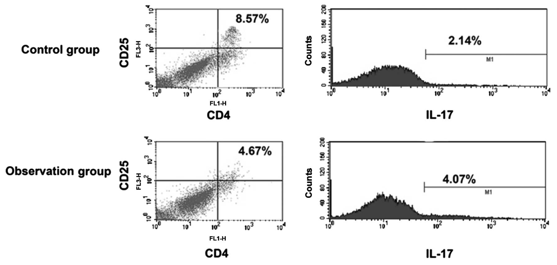 A 2×106 cells/ml sample of PBMC suspension was added to a 24-well culture plate, with 1 ml in each well. Phorbol myristate acetate (20 ng/ml; Sigma-Aldrich, St. Louis, MO, USA), ionomycin (1 µg/ml; Sigma-Aldrich) and monensin (2 nmol/m1; Sigma-Aldrich) were added to each well and the plates were incubated in a CO2 incubator at 37°C for 4 h. Subsequently, the cells were collected and divided into isomorphic control and sample test tubes, after which 10 µl PerCP-CD4 mAb was added and the tubes were incubated in the dark at room temperature for 30 min. Following washing with phosphate-buffered saline, the cells were fixed with 4% paraformaldehyde. The cells were maintained at room temperature for 20 min, parting medium (Dingguo Biotechnology, Inc., Beijing, China) was added and the solution was left for 10 min. Following centrifugation at 10,000 × g for 10 min at room temperature, the supernatant was discarded and the cells were resuspended. Next, 10 µl PE-IL-17mAb artificial antigen (BD Biosciences) was added to the sample test tube, while 10 µl PE-Ig-G1mAb (BD Biosciences) was added to the isomorphic control test tube. The tubes were incubated at room temperature in the dark for 1 h. Flow cytometry (FC 500; Beckman Coulter, Inc.) was conducted following washing and resuspension, using CXP software.