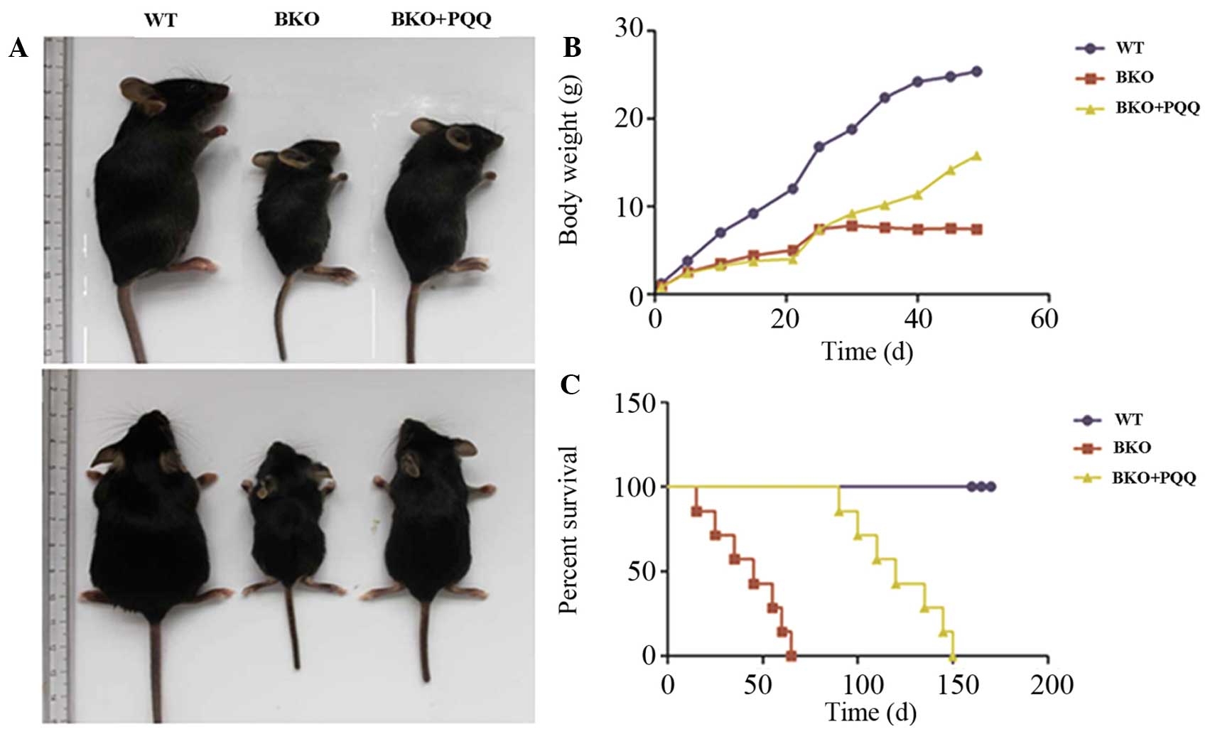 In order to investigate the effect of PQQ on the whole body phenotype of the Bmi-1−/− mice, the animals were divided into three groups of six mice (WT, BKO and BKO + PQQ). Statistical analysis was conducted on the size, shape, degree of hair smoothness, body weight and percentage survival in the different groups of mice.