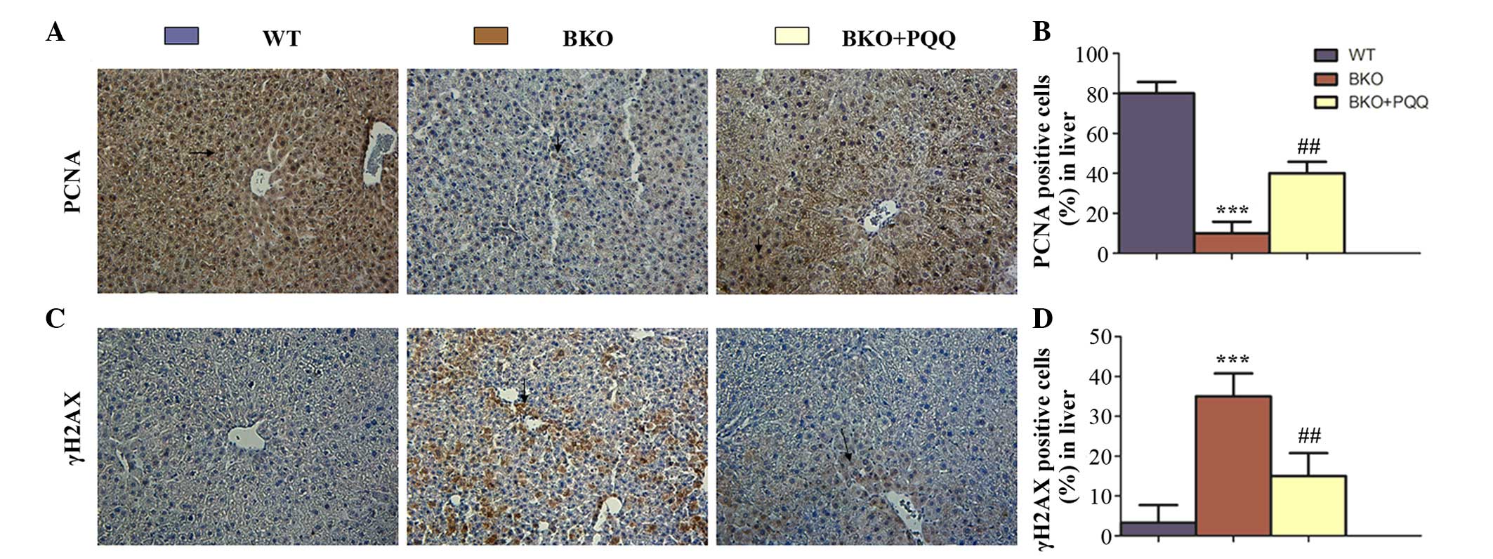 In conclusion, the results of the present study indicate that treatment of BKO mice with a moderate dose of PQQ significantly protects the liver from deleterious effects by inhibiting oxidative stress and participating in DNA damage repair. Therefore, PQQ has a great potential as a therapeutic agent against oxidative stress during liver damage.