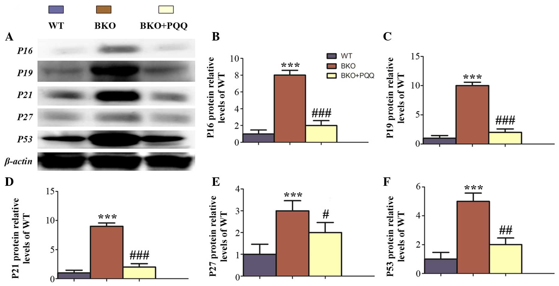 Cell proliferation is known to be mediated by the expression and activation of tumor-suppressor genes (31); thus, the expression levels of the cell cycle proteins, P16, P19, P21, P27 and P53, were examined (Fig. 5A). The results revealed that the BKO mice promoted the expression of the tumor-suppressors, P16, P19, P21, P27 and P53. However, administration of the PQQ-supplemented diet in the BKO mice prevented the increased expression levels of P16, P19, P21, P27 and P53 (Fig. 5B–F).