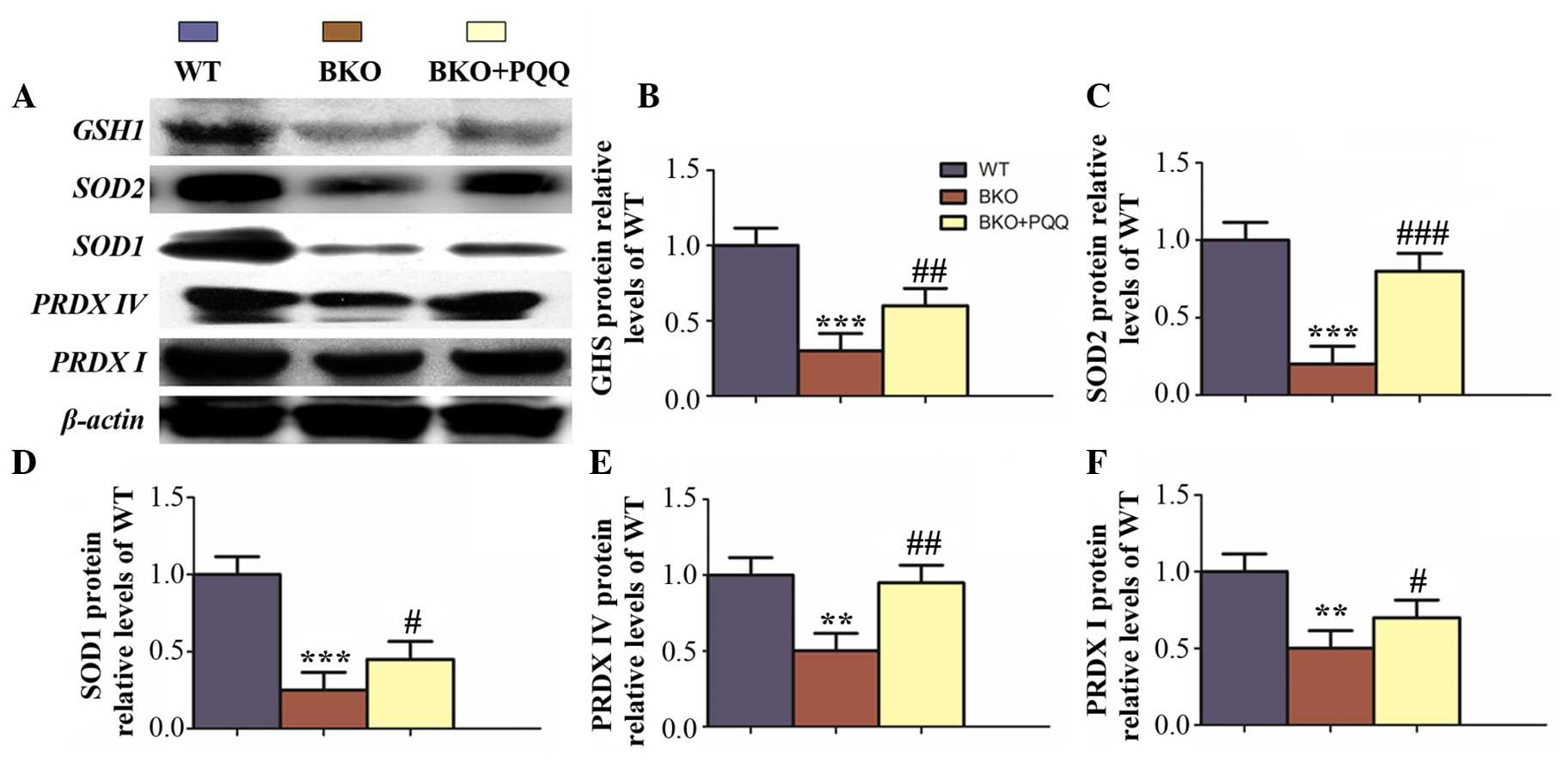 To further investigate whether the effects of PQQ were associated with the enhanced expression levels of various antioxidant proteins, western blot analysis was performed to examine the protein expression levels of PRDX I, PRDX IV, SOD1, SOD2 and GSH (Fig. 7A). The results demonstrated that the expression of all the antioxidant proteins were downregulated in the BKO mice when compared with the WT mice, which was consistent with immunohistochemical staining results. Notably, the expression levels of all the antioxidant proteins were increased to a viable level in the BKO + PQQ mice when compared with the BKO mice (Fig. 7B–F). These observations indicated that PQQ promoted an antioxidant effect to protect against BKO-induced oxidative stress.