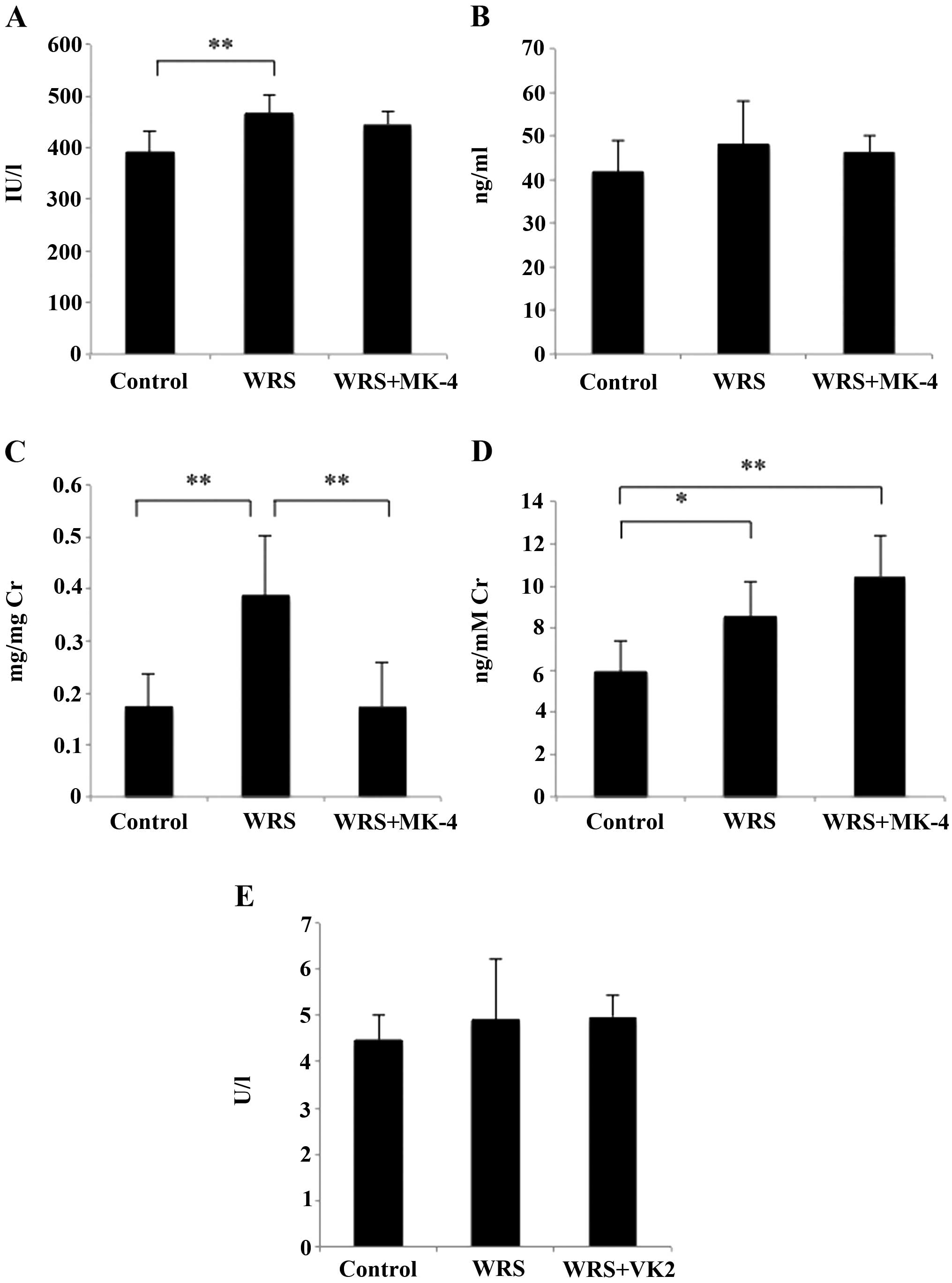 Data are expressed as the mean ± standard deviation. In order to compare the differences between the control, WRS and WRS + MK-4 groups, a one-way analysis of variance (ANOVA), followed by the Tukey-Kramer post hoc test, was employed using JMP 10 software (SAS Institute Inc., Cary, NC, USA). P<0.05 was considered to indicate a statistically significant difference.