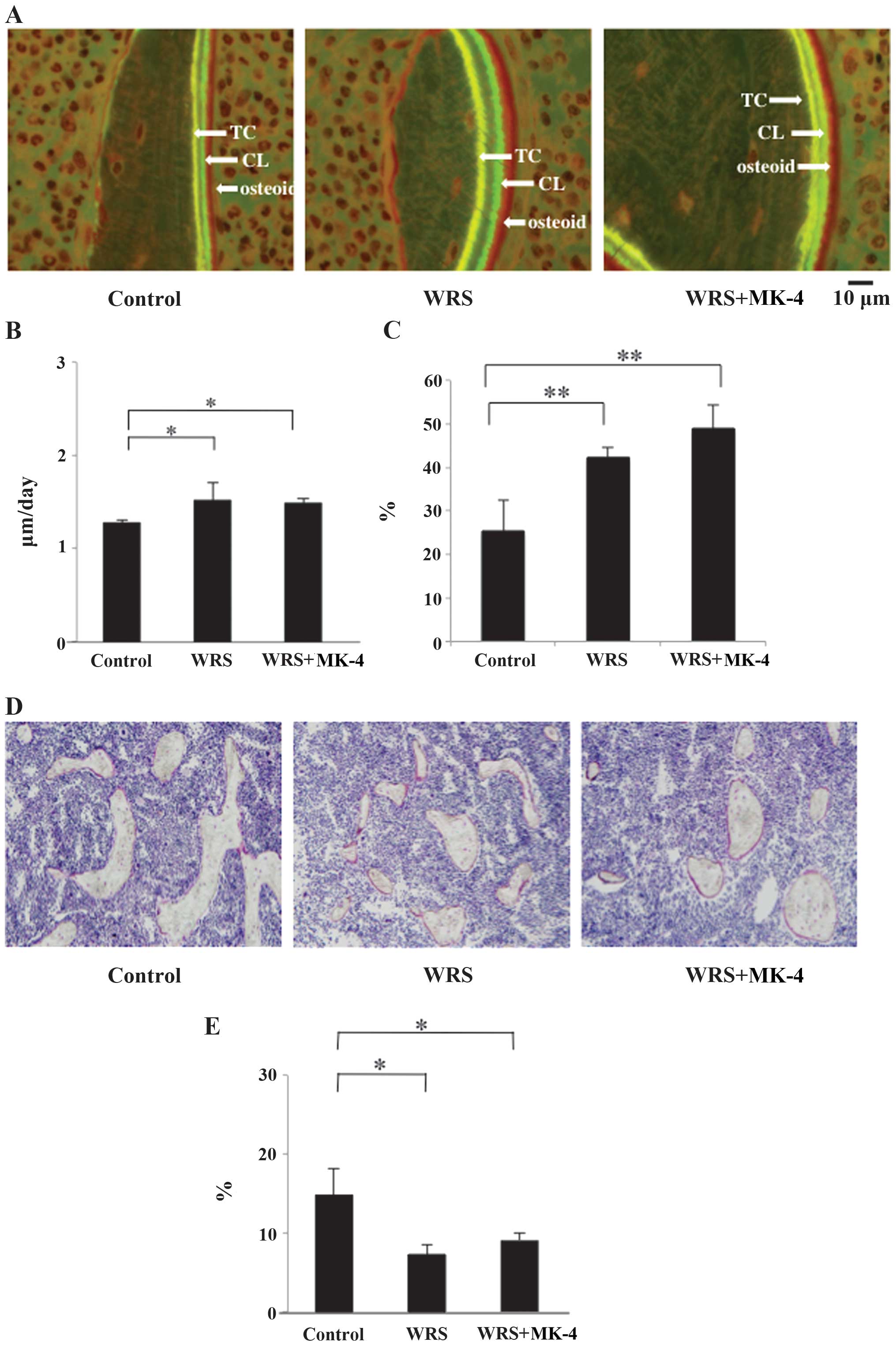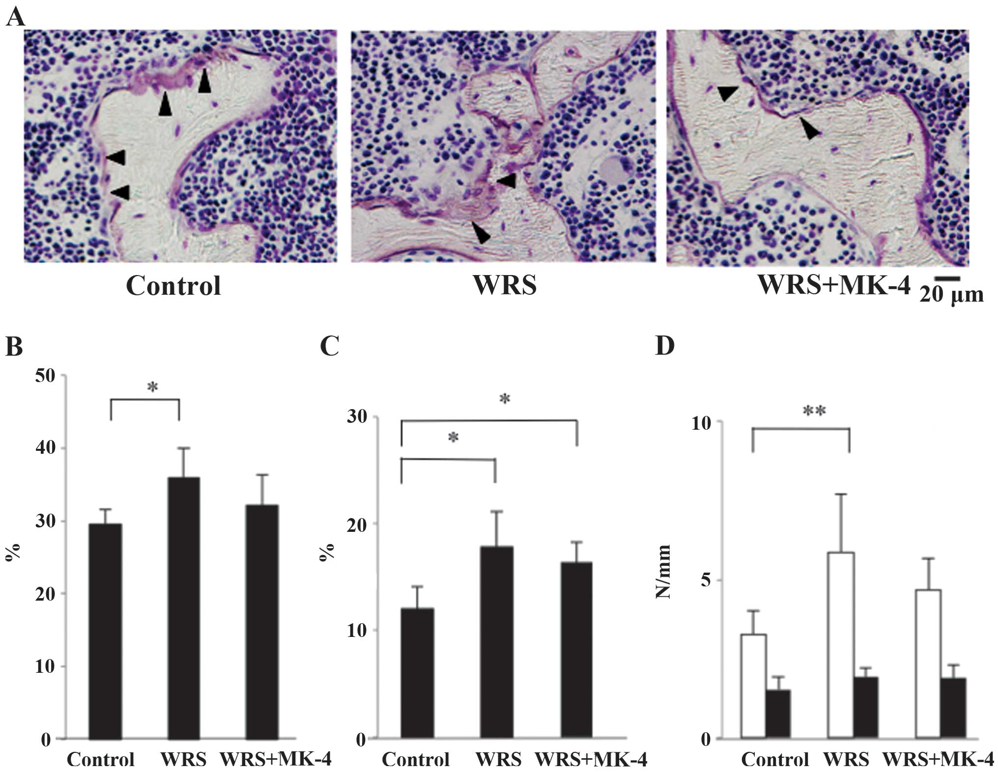 The bone resorption area was first evaluated using bone histomorphometry (Fig. 4A). The ES/BS percent age was significantly higher in the WRS group than that in the control group (Fig. 4A and B) and was effectively reduced by MK-4.