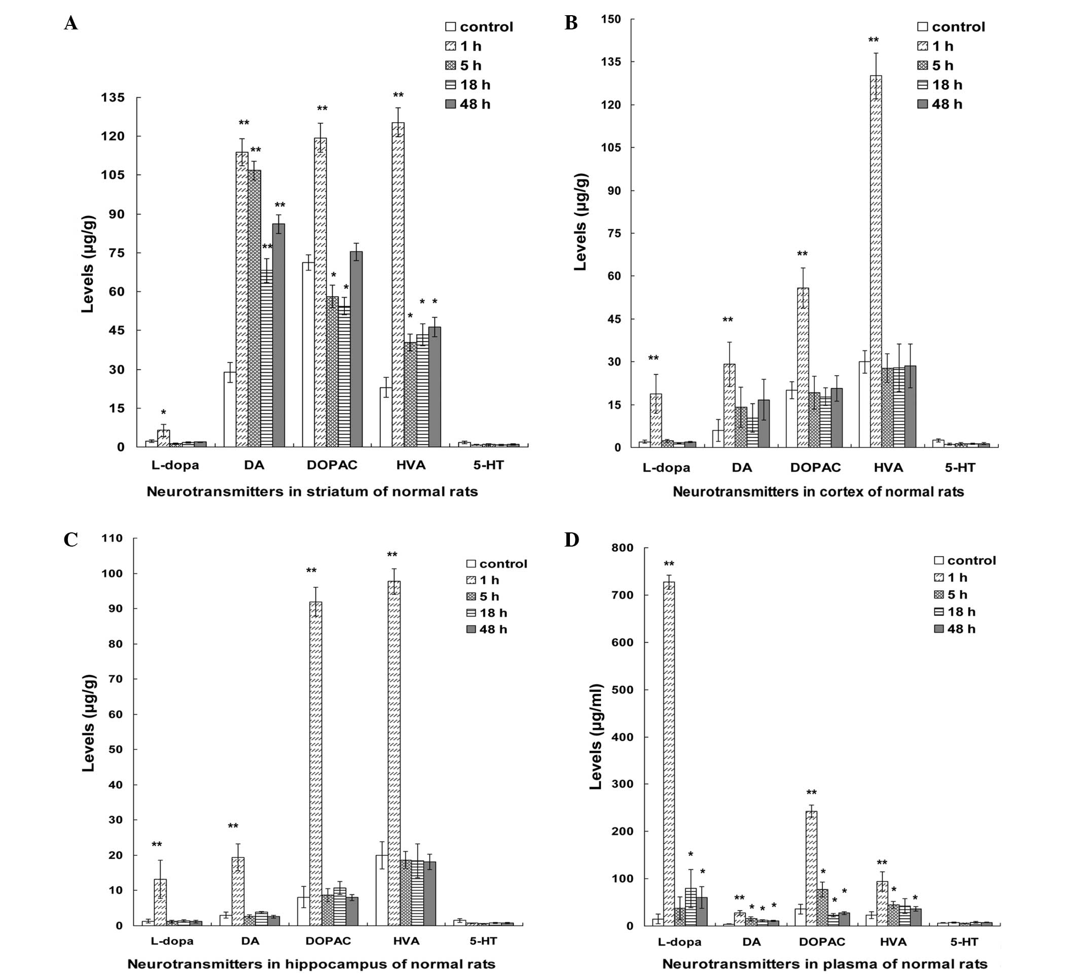 In the present study, it was observed that the striatal levels of L-dopa, DA, DOPAC and HVA increased after the co-administration and peaked at 1 h, followed by reduction or return to the normal levels between 5 and 48 h. Notably, DA metabolism occurs primarily in the striatum (19). The present results suggested that striatal DA levels were increased compared with those in the hippocampus, cortex and plasma within 48 h, indicating that the co-administration may aid in maintaining DA levels in the striatum.