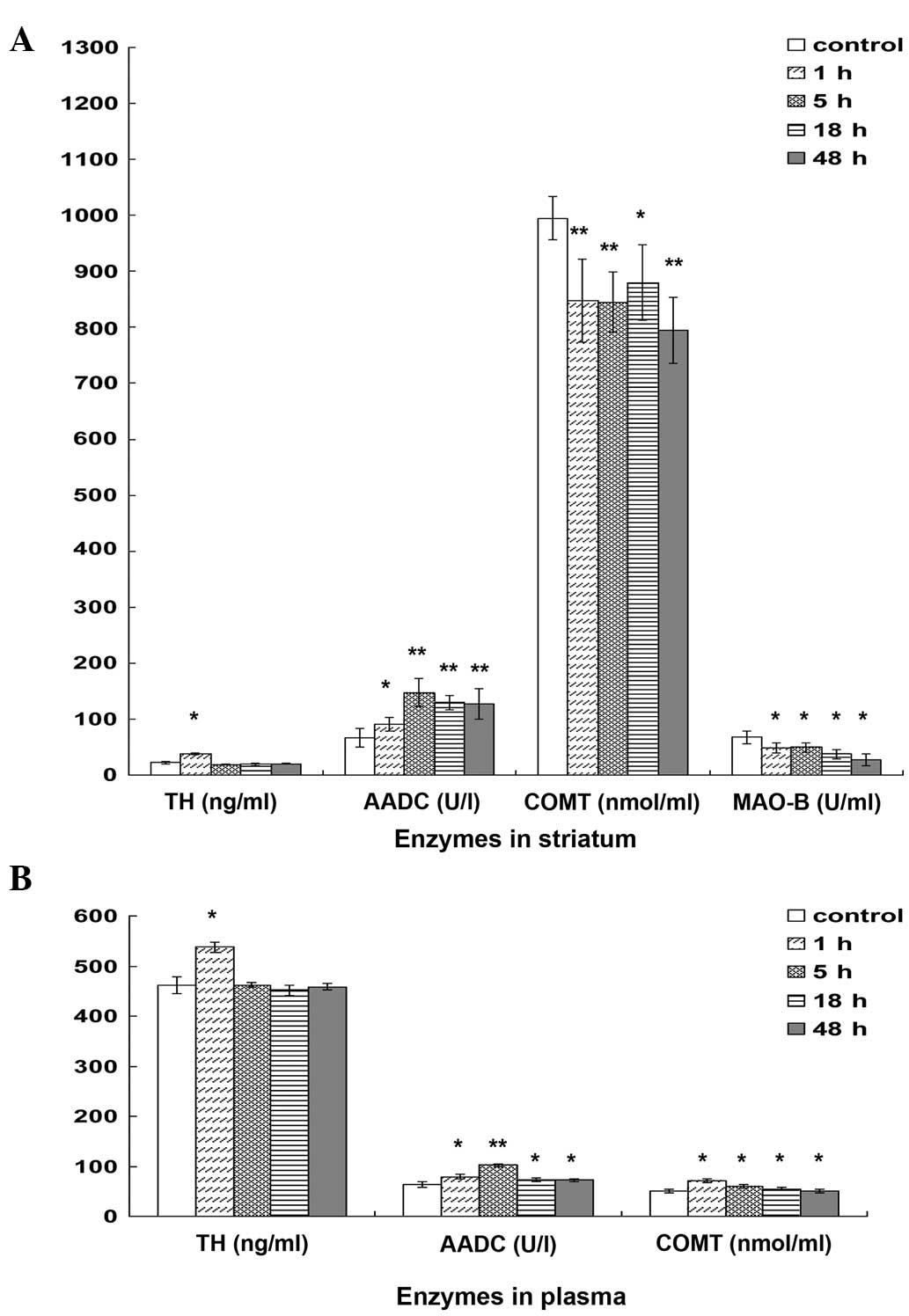 In the plasma, the levels of L-dopa, DA, DOPAC and HVA increased and peaked at 1 h after the co-administration, and then showed a sharp decrease between 5 and 48 h. Based on the ratios of DA/L-dopa and (DOPAC + HVA)/DA, the turnover rate of L-dopa was found to peak at 5 h after co-administration, followed by a rapid decline between 5 and 48 h. However, the turnover rate of DA exhibited a sharp decrease between 1 and 48 h compared with control group. In addition, TH levels increased and peaked at 1 h prior to returning to the normal levels. AADC levels peaked at 5 h, and were higher compared with the control group. In addition, COMT levels exhibited a decreasing trend within 48 h compared with the control group. Thus, collectively the present results suggest that the co-administration may promote the generation of DA by enhancing the activity of AADC, in addition to reducing the metabolism of DA by inhibiting the activity of COMT.