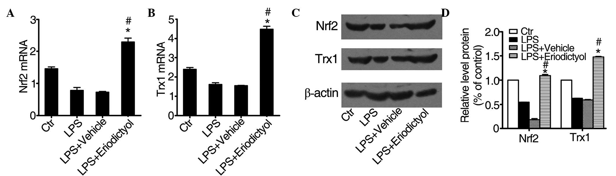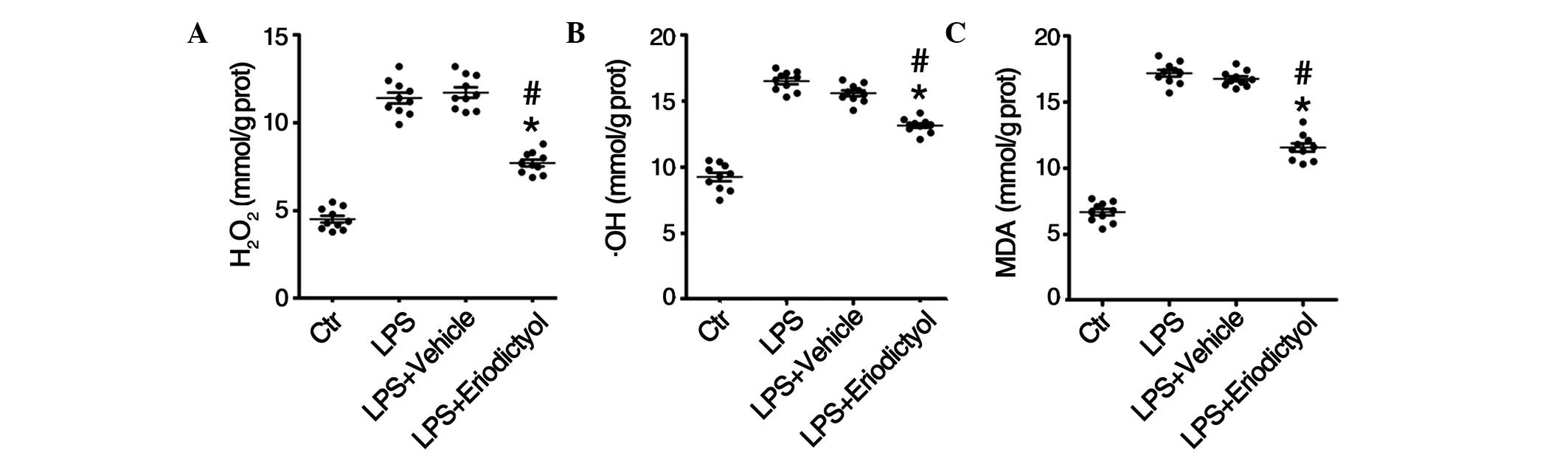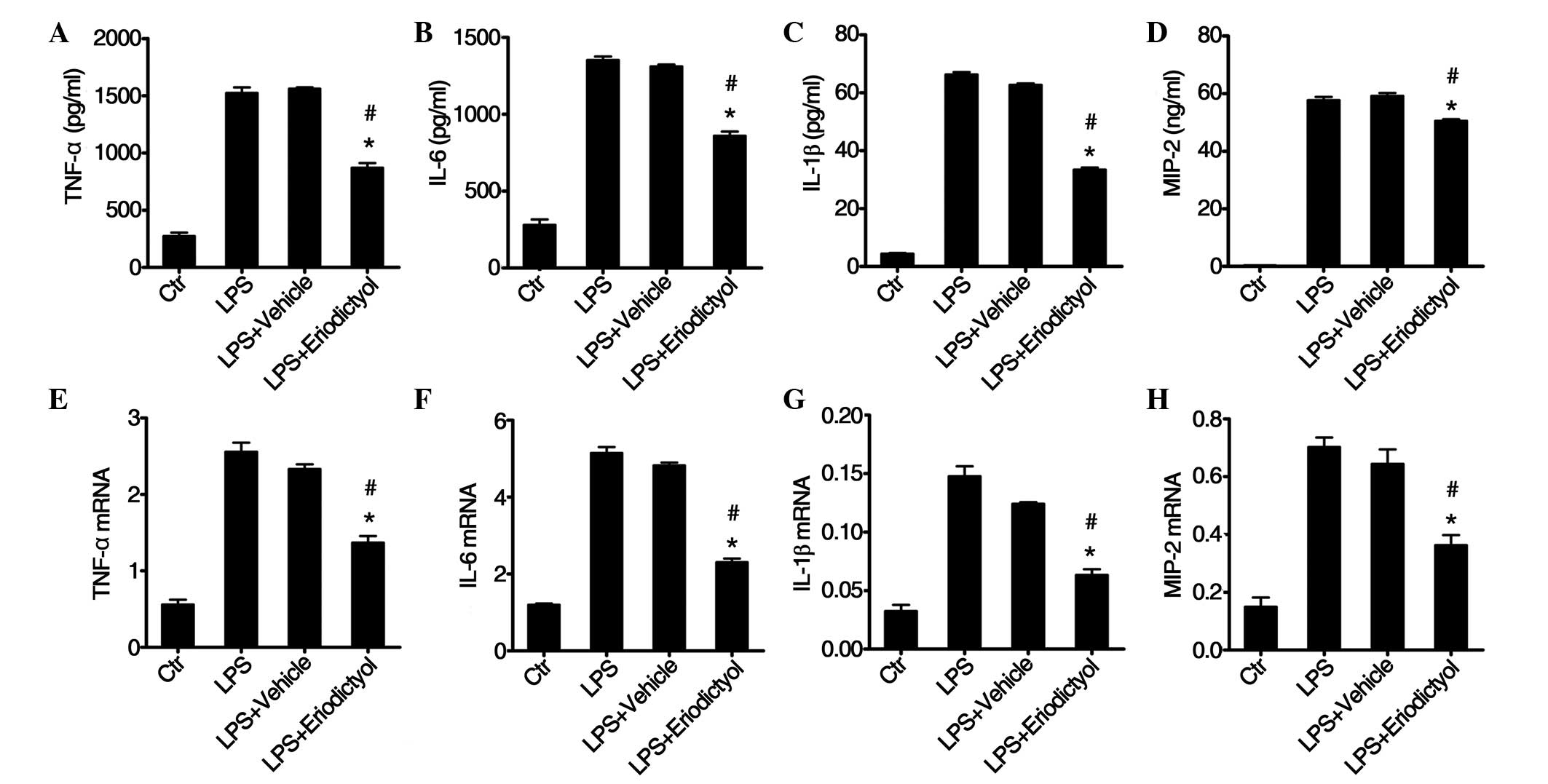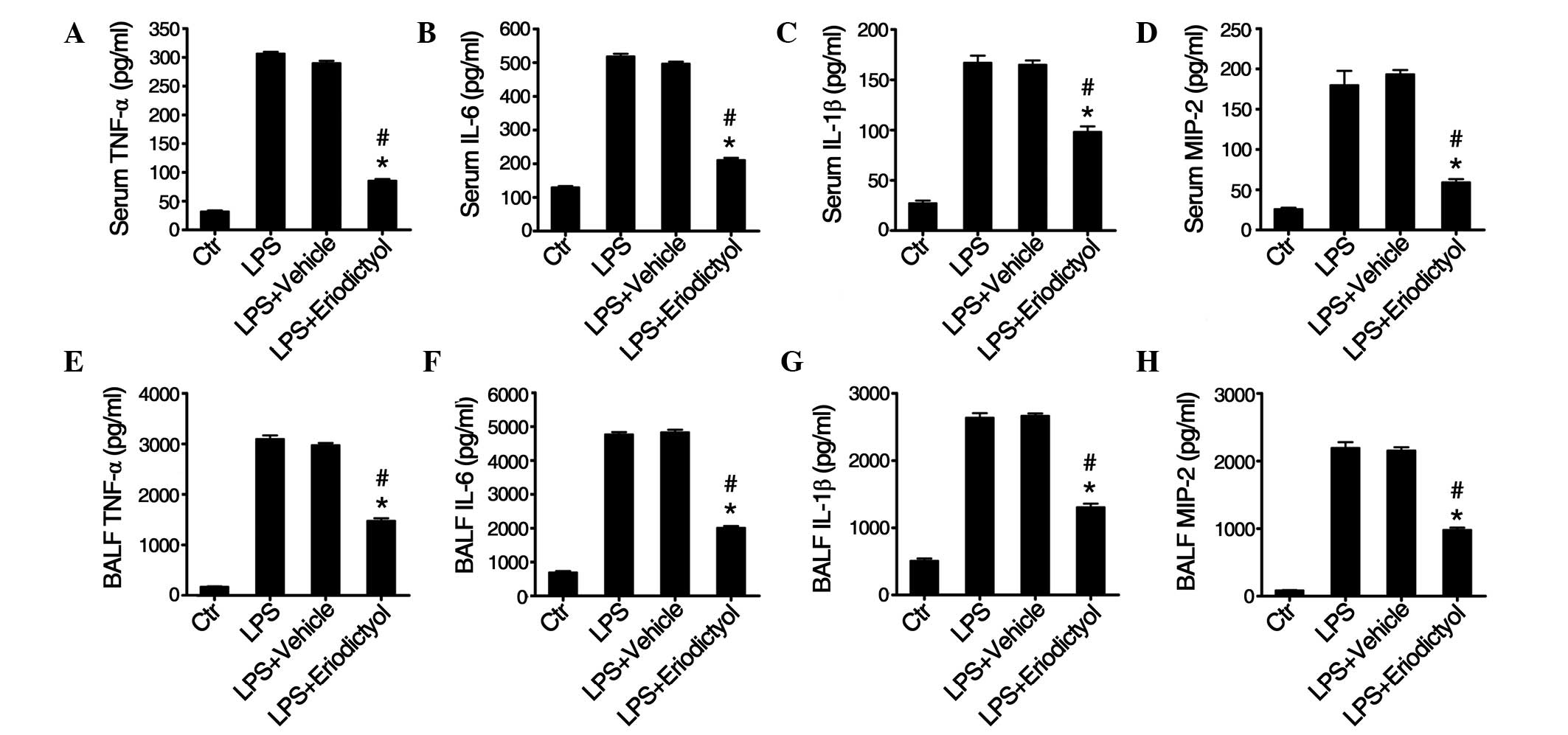 Zhu GF, Guo HJ, Huang Y, Wu CT and Zhang XF: Eriodictyol, a plant flavonoid, attenuates LPS‑induced acute lung injury through its antioxidative and anti‑inflammatory activity. Exp Ther Med 10: 2259-2266, 2015.