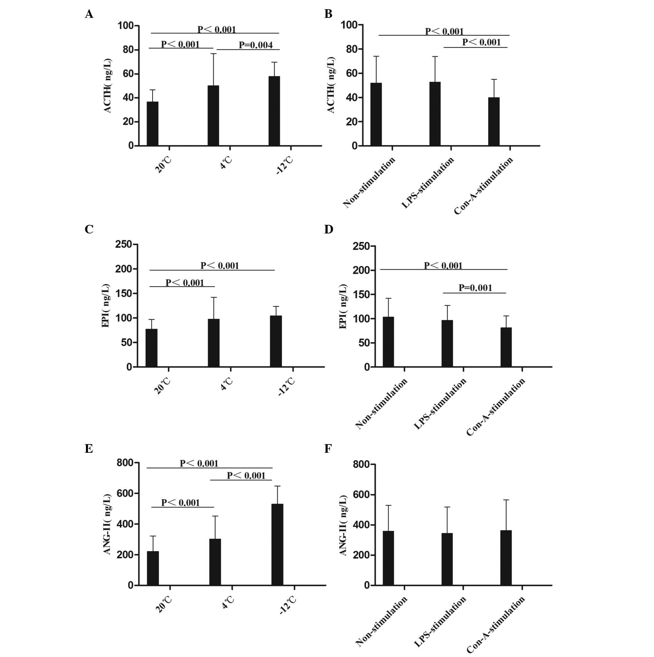 The mean levels of ACTH, EPI and ANG-II were compared at different times, temperatures, and in response to various stimulants (Figs. 1 and 2). Compared with the results at 20°C, the level of ACTH in the rat plasma was increased at the 1–48-h time-points in the 4 and −12°C non-stimulation groups; at the 1–48-h time-points at 4°C and at the 1–24-h time-points at −12°C in the LPS-stimulation group; and at the 1–48-h time-points in the −12°C Con-A-stimulation group (Figs. 1A and B and 2A). With regard to EPI levels, comparisons with the values at 20°C revealed increases in the 4°C and −12°C non-stimulation groups at the 1–48-h time-points, in the 4°C LPS-stimulation group at the 1–48-h time-points, in the −12°C LPS-stimulation group at the 1–24-h time-points, in the 4°C Con-A-stimulation group at the 1–12-h time-points and in the −12°C Con-A-stimulation group at 1, 12 and 48 h (Figs. 1C and D and 2B). Compared with the results at 20°C, the level of ANG-II in the rat plasma was increased in the 4°C and −12°C non-stimulation and LPS-stimulation groups at the 1–48-h time-points, in the 4°C Con-A-stimulation group at 1 h and in the −12°C Con-A-stimulation group at the 1–48-h time-points (Figs. 1E and F and 2C).