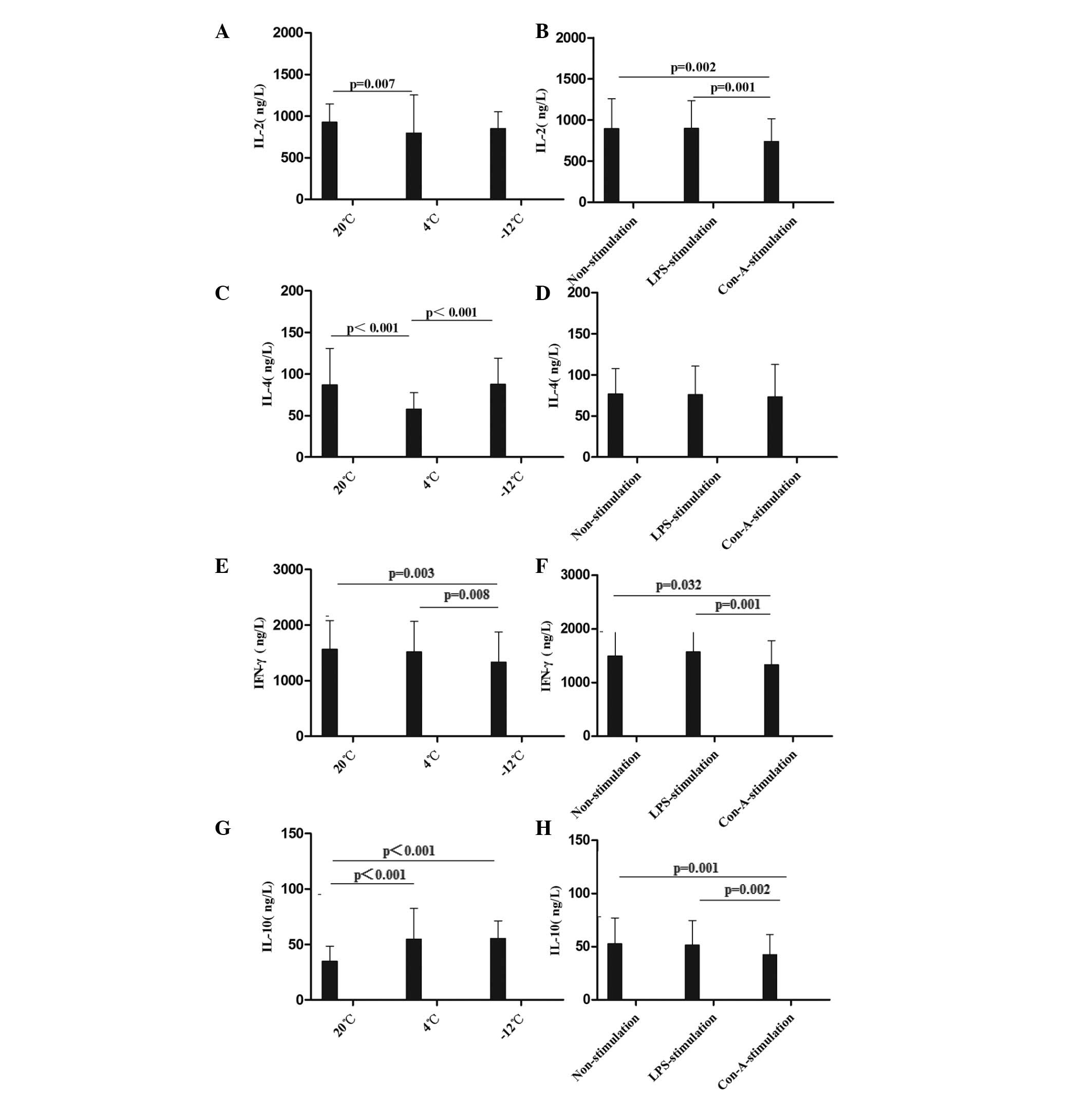 The mean levels of IL-2, IL-4, IFN-γ and IL-10 were compared at different times, temperatures, and in response to various stimulants (Figs. 3 and 4). Compared with the values at 20°C, the level of IL-2 in the rat plasma was decreased at 24 h in the 4°C non-stimulation and LPS-stimulation groups, at the 24–48-h time-points in the −12°C non-stimulation and LPS-stimulation groups, at the 1–48-h time-points in the 4°C Con-A-stimulation group and at the 12–48-h time-points in the −12°C Con-A-stimulation group (Figs. 3A and B and 4A). With regard to the level of IL-4 in the rat plasma, comparisons with the results at 20°C revealed decreases at the 12–48-h time-points in the 4 and −12°C non-stimulation and LPS-stimulation groups, at the 1–24-h time-points in the 4°C Con-A-stimulation group and at 12 h in the −12°C Con-A-stimulation group (Figs. 3C and D and 4B). The level of IFN-γ in the rat plasma was decreased at the 12–24-h time-points in the 4°C non-stimulation and LPS-stimulation groups, at 1, 24 and 48 h in the −12°C non-stimulation and LPS-stimulation groups, at the 12–24-h time-points in the 4°C Con-A-stimulation group and at the 1–12-h time-points in the −12°C Con-A-stimulation group compared with the results at 20°C (Figs. 3E and F and 4C). By contrast, the level of IL-10 in the rat plasma was increased at the 1–48-h time-points in the 4 and −12°C non-stimulation and LPS-stimulation groups and at the 1–48-h time-points in the −12°C Con-A-stimulation group compared with the values at 20°C (Figs. 3G and H and 4D).