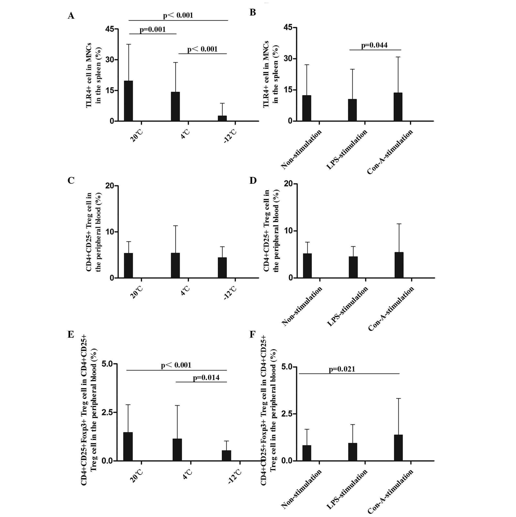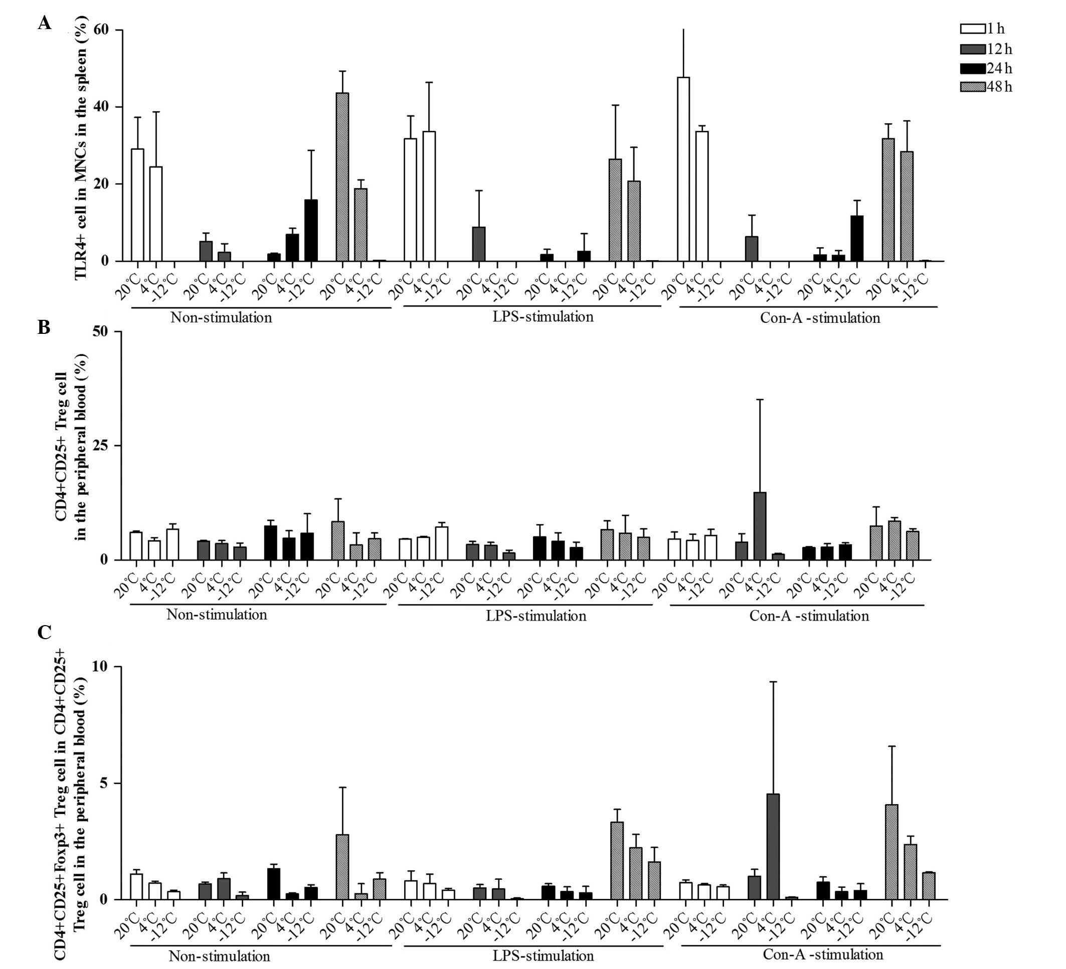 The mean levels of CD4+CD25+ and CD4+CD25+Foxp3+ Treg cells in the peripheral blood were compared at different times, temperatures, and in response to various stimulants (Figs. 5 and 6). CD4+CD25+ Treg cell rates in the peripheral blood were decreased at the 1–48-h time-points at 4°C and at the 12–48-h time-points at −12°C in the non-stimulation group; at the 12–48-h time-points in the −12°C LPS-stimulation group; and at 1 h in the −12°C Con-A-stimulation group, compared with the results at 20°C (Figs. 5C and D and 6B). With regard to the percentage of CD4+CD25+Foxp3+ Treg cells, significant decreases were observed at 1, 24 and 48 h at 4°C and at the 1–48-h time-points at −12°C in the non-stimulation, LPS-stimulation and Con-A-stimulation groups, particularly at −12°C (Figs. 5E and F and 6C). Greater temperature decreases resulted in more marked decreases in the percentage of CD4+CD25+Foxp3+ Treg cells.