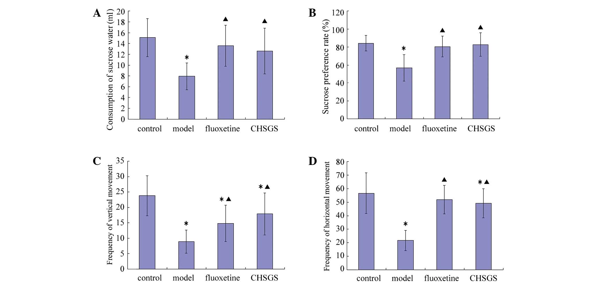A total of 60 SD rats were used. The baseline scores of the sucrose consumption test and OFT were determined, and then 48 SD rats with similar behavior were identified and randomly divided into four groups: Control, model, fluoxetine and CHSGS groups (n=12 per group).