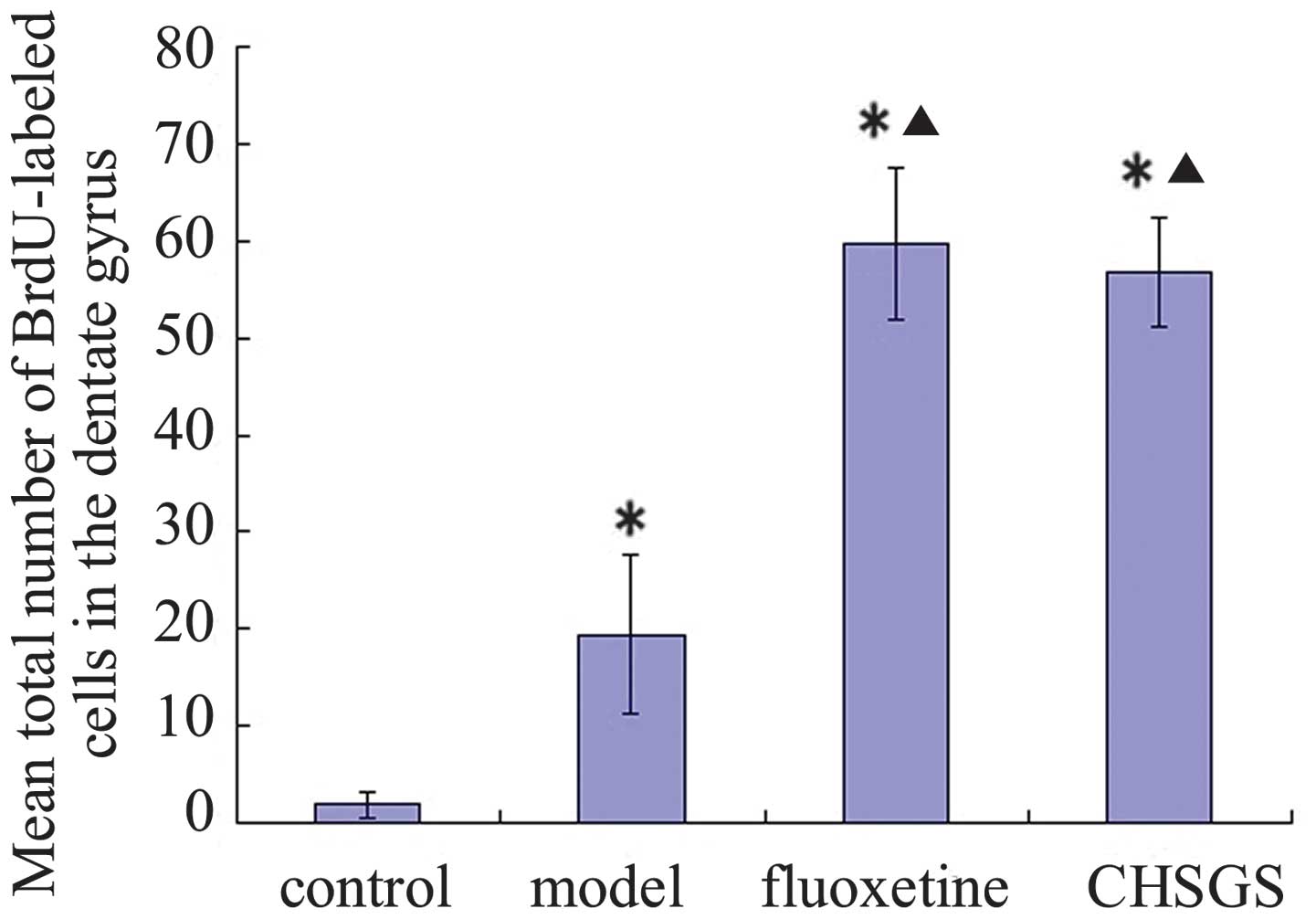 Immunofluorescence staining indicated the presence of BrdU-labeled cells in the hippocampal dentate gyrus (Fig. 2). After 28 days of treatment, the number of BrdU-labeled cells increased significantly in the hippocampal dentate gyrus of the model, fluoxetine and CHSGS groups compared with the control group (P<0.05). Furthermore, compared with the model group, the number of BrdU-labeled cells increased significantly in the hippocampal dentate gyrus in the fluoxetine and CHSGS groups (P<0.05). No significant difference was identified between the fluoxetine and CHSGS groups (P>0.05; Fig. 3).