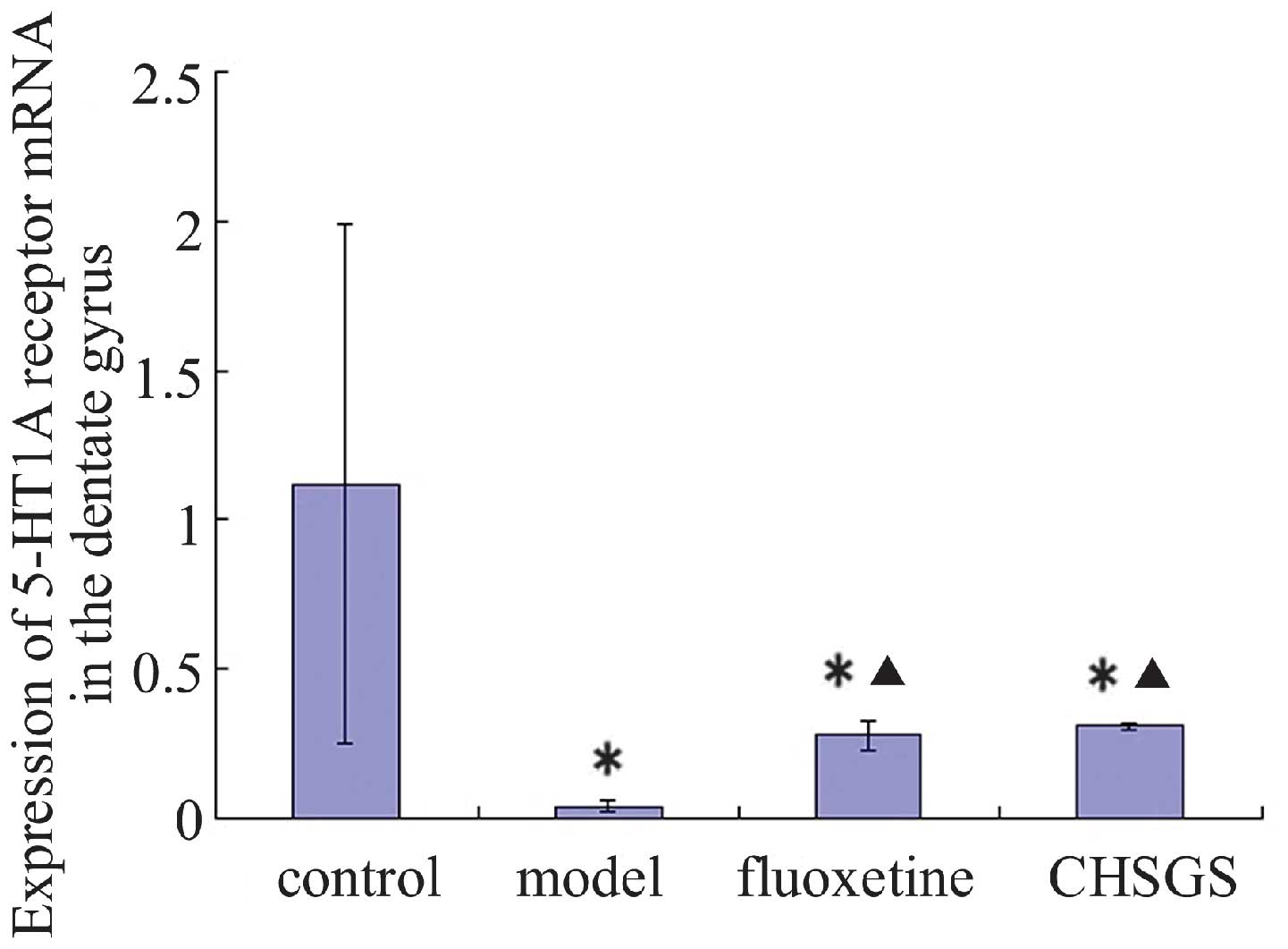 Following 28 days of treatment, the expression levels of 5-HT1A receptor mRNA decreased in the model, fluoxetine and CHSGS groups compared with the control group (P<0.05). Compared with the model group, the expression levels of 5-HT1A receptor mRNA were enhanced in the fluoxetine and CHSGS groups (P<0.05). However, no difference in 5-HT1A expression levels was observed between the fluoxetine and CHSGS groups (P>0.05; Figs. 4 and 5).