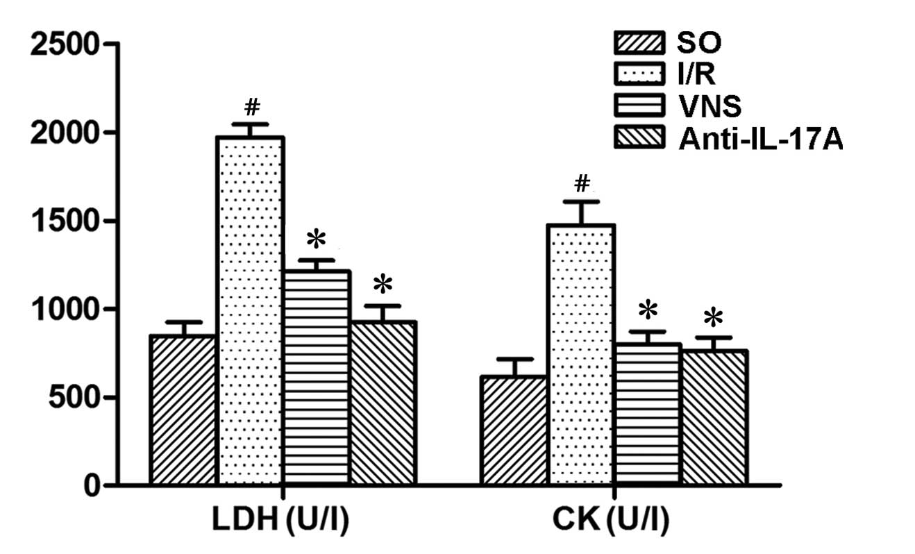 Following 4 h reperfusion, the activity levels of LDH and CK in the I/R group were significantly increased, as compared with those in the SO group. Furthermore, VS or administration of anti-IL-17A significantly inhibited the increase of LDH and CK levels (P<0.05; Fig. 2)