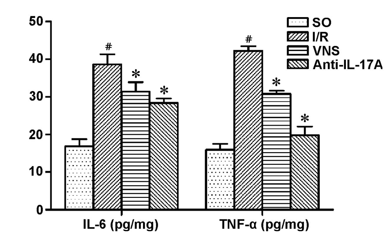 In the SO, I/R and anti-IL-17A groups, rats underwent right cervical vagus nerve trunk exposure without stimulation. In the VS group, the right cervical vagus nerve trunk was isolated from the surrounding tissue with a small piece of parafilm. A pair of bipolar platinum electrodes, covered with warmed paraffin oil for insulation, was placed on the vagus nerve trunk and the vagal nerve was subsequently stimulated by rectangular electrical pulses at 10 Hz for 2 msec using a S88 Nerve and Muscle Stimulator (Grass Technologies; Natus Neurology Inc., Warwick, RI, USA). The electrical voltages of the pulses were optimized in each rat during stimulation in order to obtain a 10% reduction in heart rate from the baseline values. The actual stimulus voltage was 1–7 V.