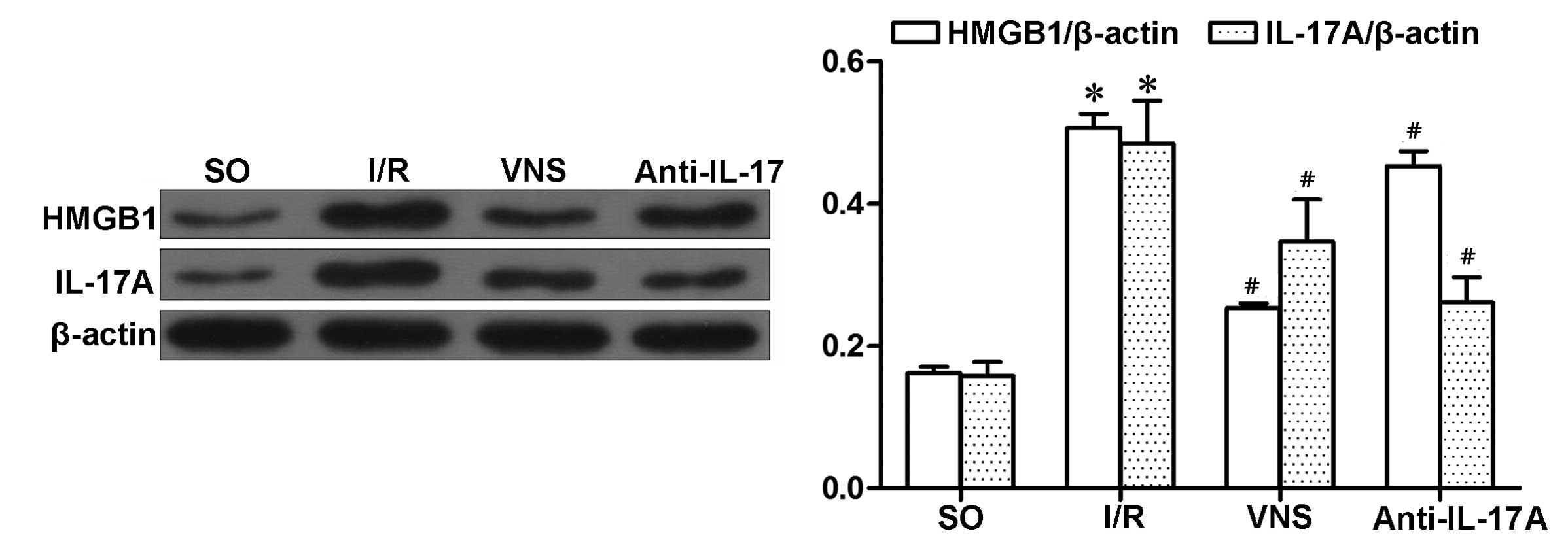 TNF-α and IL-6 levels in the I/R group were significantly increased, as compared with the other groups (P<0.05; Fig. 3). IL-17A and HMGB1 expression levels in the I/R group were markedly increased, as compared with the other groups. Similarly, VS decreased the expression levels of IL-17A and HMGB1, as compared with the I/R group (both P<0.05). Furthermore, administration of anti-IL-17A mAbs inhibited the expression levels of IL-17A and HMGB1 (P<0.05; Fig. 4), which were induced by I/R injury. However, the reductions in HMGB1 expression levels were lower (P=0.0318; Fig. 4), as compared with in IL-17A.