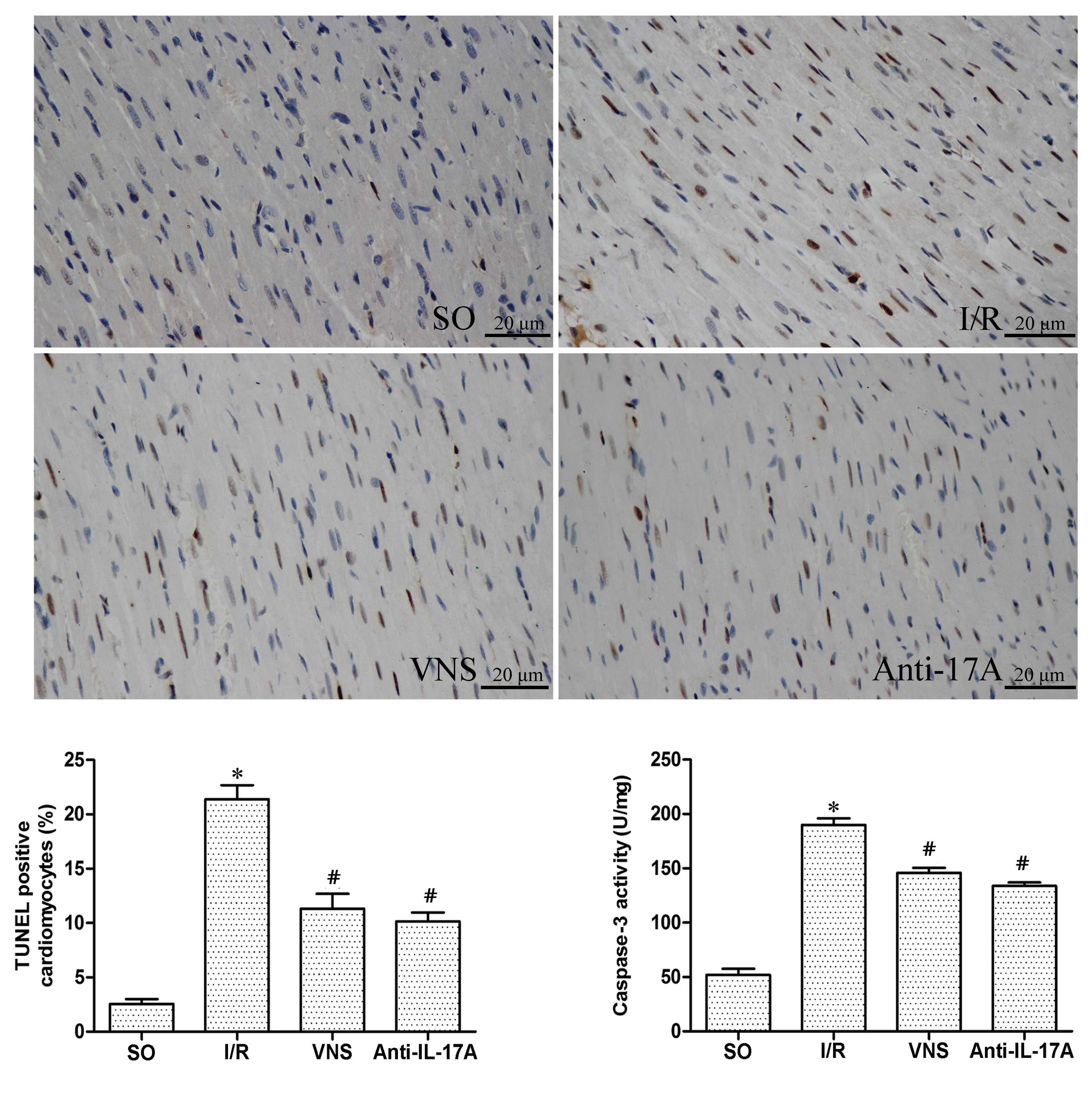 The percentage of TUNEL-positive cardiomyocytes was markedly increased in the I/R group, as compared with the other treatment groups (Fig. 6). Similar trends in the activity of caspase-3 were demonstrated following I/R. These results suggest that I/R may have induced an increase in the apoptosis of cardiomyocytes, and VS or treatment with anti-IL-17A mAbs may attenuate I/R-induced apoptosis.