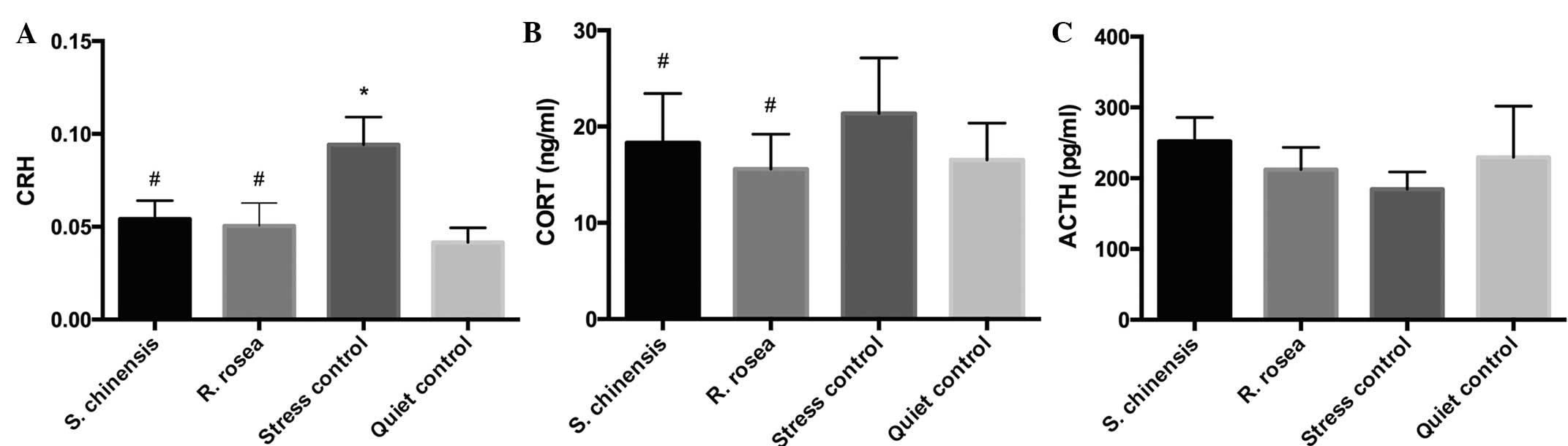 In a previous study, we established an acute stress model in which adult rats were subjected to water-floating and high-intensity exercise, with the aim of simulating psychological and physical stress, respectively (27). The aim of the present study was to investigate the effects of S. chinensis and R. rosea in rats subjected to acute compound stress, and to determine the underlying mechanisms by evaluating the serum levels of ACTH, CORT and IL-1β and the mRNA expression levels of CRH, NPY, c-Fos and Fra-2 in the whole hypothalamus of the rats exposed to S. chinensis and R. rosea.