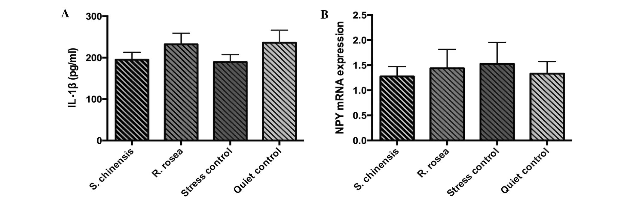 In the present study, the effects of S. chinensis and R. rosea on the immune system were investigated by evaluating the serum levels of IL-1β, which is a typical stress-associated cytokine and the most extensively studied inflammatory cytokine. The immune inflammatory response is considered to be closely associated with the stress system. Activation of the HPA axis produces marked inhibitory effects on the immune inflammatory response, as virtually all the components of the immune response are inhibited by cortisol (43). In turn, cytokines including TNF-α, IL-1β and IL-6 stimulate the HPA axis independently, or in combination with one another (44). IL-1 is a critical mediator of adaptive stress responses, in addition to stress-associated neuropathology and psychopathology (45). A recent study demonstrated that the activation of the HPA axis by IL-1β is dependent on IL-1 type 1 receptors in non-hematopoietic cells, such as brain endothelial cells, but not in perivascular macrophages (46). Furthermore, a 15-min swim stress has been shown to provoke a significant reduction in lipopolysaccharide (LPS)-induced IL-1β production at 120 and 240 min following LPS challenge (<200 pg/ml), compared with the control (>600 pg/ml) (47). In the present study, serum IL-1β levels in the rats were mildly, but not significantly, suppressed by compound stress. Treatment with S. chinensis and R. rosea appeared to increase the stress-reduced IL-1β levels. However, their effect on peripheral IL-1β levels was also mild and requires further investigation.