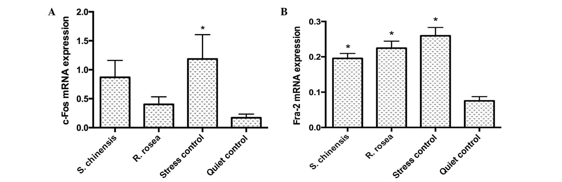 The c-Fos and Fra-2 mRNA expression levels in the hypothalamus of the stress control group were significantly higher compared with those of the quiet control (P<0.05). The c-Fos mRNA expression levels in the S. chinensis and R. rosea groups did not differ significantly compared with those in the quiet control group (P>0.05). The Fra-2 expression level in the S. chinensis and R. rosea groups did not significantly differ from the stress control group, but did show a significant difference compared with the quiet control group (P<0.05; Fig. 3).
