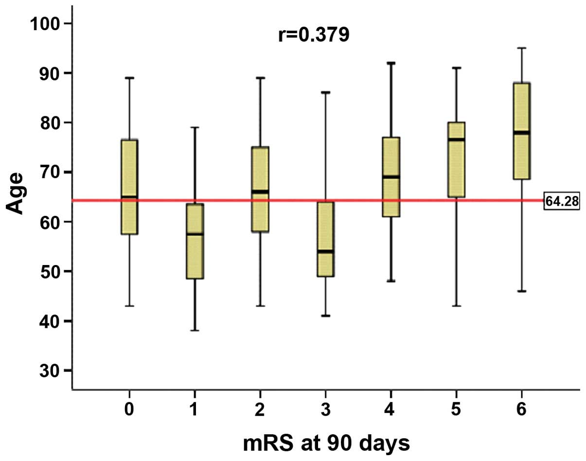 Clinical characteristics such as age, gender, hematoma volume and location, and BP at different time points were analyzed for patients that succumbed as well as survivors (Table I). Mortality was closely associated with age (P<0.001) although not with gender. Mortality was significantly associated with BP at 30 min, 45 min and 6 h after admission (P<0.05), although not on admission 180.33±17.17 vs. 174.72±16.13 mmHg (P=0.211). Mortality was also associated with hematoma volume but not with the location. The average age of patients who succumbed was significantly higher than that of the survivors (75.53 vs. 62.79 years, P=0.001). Higher mRS scores, signifying worse recovery of neurological functions following cerebral hemorrhage, were primarily found in senior patients aged over 64.25 years (r=0.375, P<0.001. Fig. 1). By contrast, the effect of gender on the mRS score was not significant.
