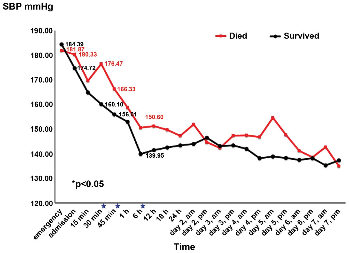 BP was recorded for each patient at the following time points: i) emergency, ii) admission, ii) once every 6 h during the first 24 h after admission, and iv) twice per day after 24 h and within 1 week.