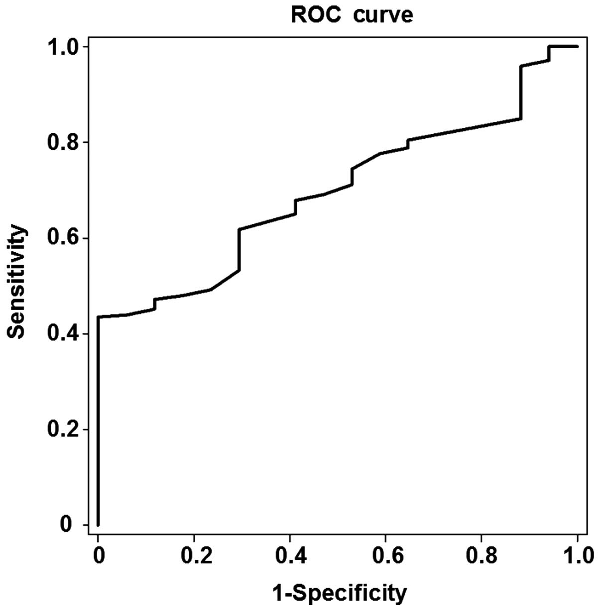 In order to determine the diagnostic accuracy of Fibroscan for the prediction of liver fibrosis development in patients with CHB, ROC analysis was performed. Among the 263 patients, 246 were found to have stage S1-S4 liver fibrosis and 17 had stage S0 liver fibrosis. As shown in Fig. 1, the area under the ROC curve for the prediction of liver fibrosis development was 0.696, and the optimal cut-off value was 5.55 kPa in the patients with stage S1 liver fibrosis (P<0.05). The threshold of the optimal cut-off value had a sensitivity of 61.8% and a specificity of 70.6%.