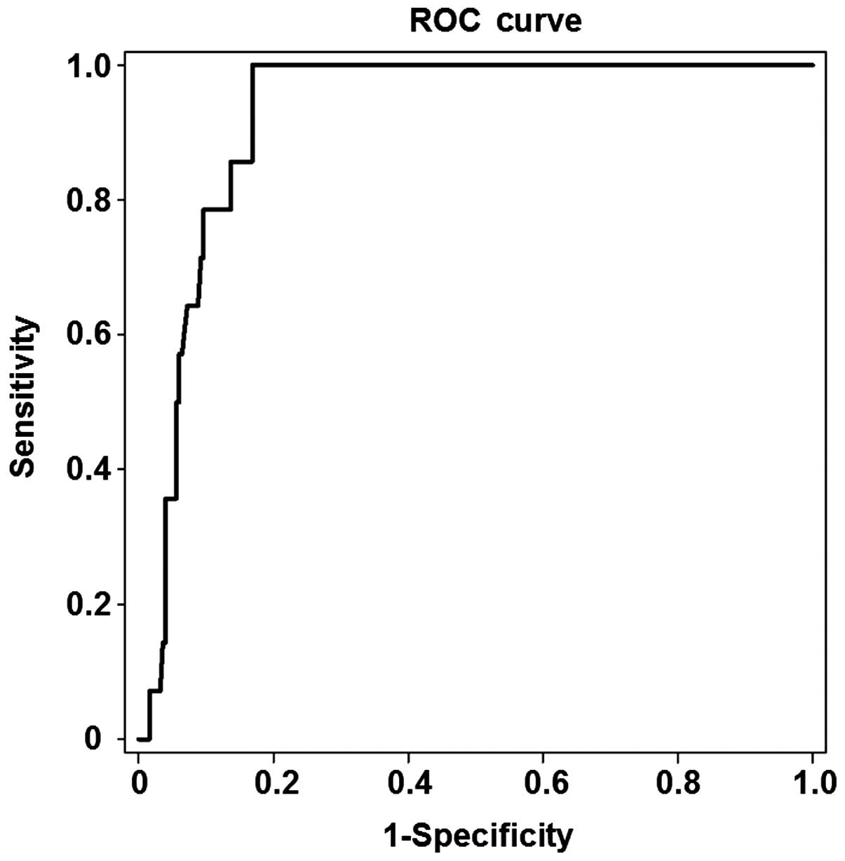 Among the 263 patients, 14 were found to have stage S3-S4 and 249 stage S0-S2 liver fibrosis. As shown in Fig. 3, the area under the ROC curve for the prediction of liver fibrosis development was 0.923, and the optimal cut-off value was 10.95 kPa in the patients with stage S3 liver fibrosis (P<0.05). The threshold of the optimal cut-off value had a sensitivity of 78.6% and a specificity of 90.4%. These results indicated that the stage of liver fibrosis can be accurately predicted by LSM in patients with CHB with ALT levels <2 times the normal upper limit. In addition, the specificity of prediction is increased with the progression of liver fibrosis.