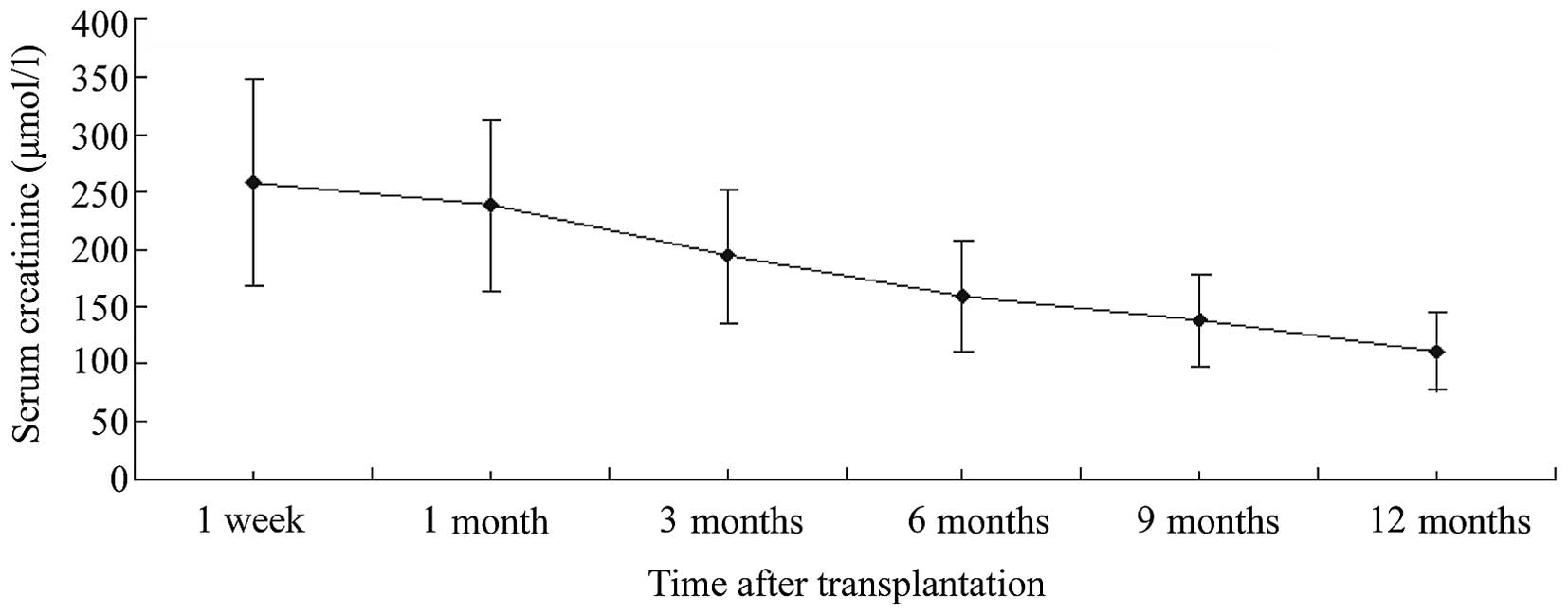 The mean sCr values at 1 week, and at 1, 3, 6, 9 and 12 months post-transplantation were 257.6 ± 89.3, 238.2 ± 74.1, 194.5 ± 57.5, 159.3 ± 48.6, 137.9 ± 40.2 and 110.8 ± 32.9 µmol/l, respectively. These results showed a favorable trend to allograft function recovery over time (Fig. 1).